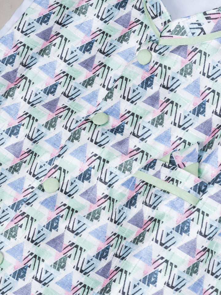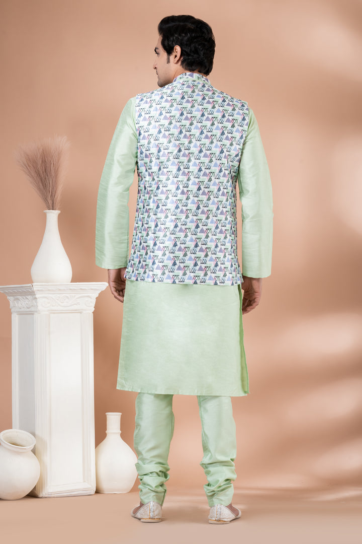 Step into festive elegance with this charming three-piece ensemble from Angasudha. Featuring a mint green Banarasi silk kurta paired with matching Banarasi silk pyjama, this outfit offers a graceful yet contemporary look. The highlight is the printed silk Nehru jacket, adorned with subtle multicolored patterns that add a modern flair to the traditional attire.