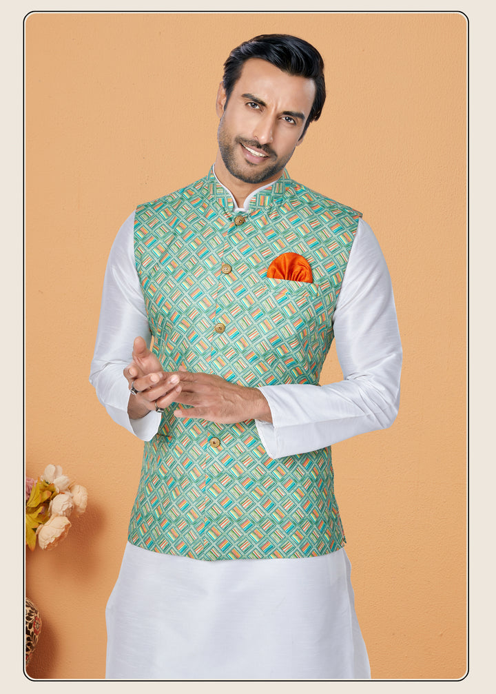 Make a bold yet elegant statement with the Mint Green Digital Print Cotton Waistcoat from Angasudha. This eye-catching piece features a vibrant multicolor digital print on soft, breathable cotton fabric, designed to keep you stylish and comfortable all day long.