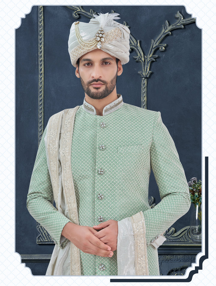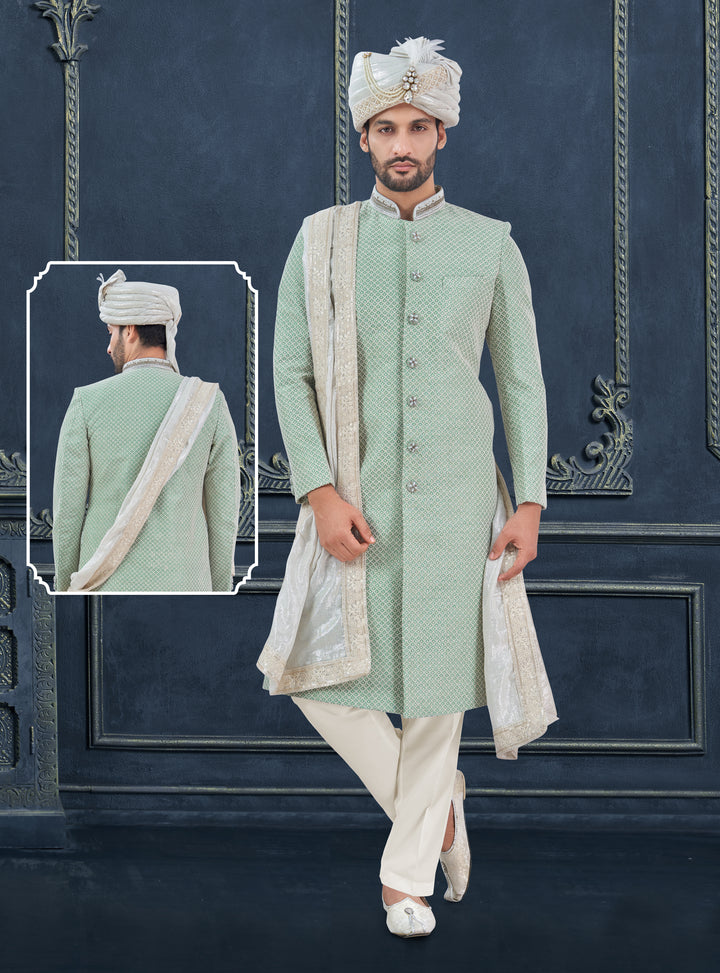 Angasudha Mint Green Textured Sherwani Set – Ideal for Marriage & Engagement Celebrations