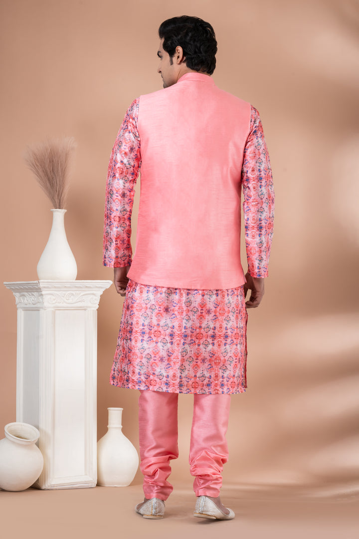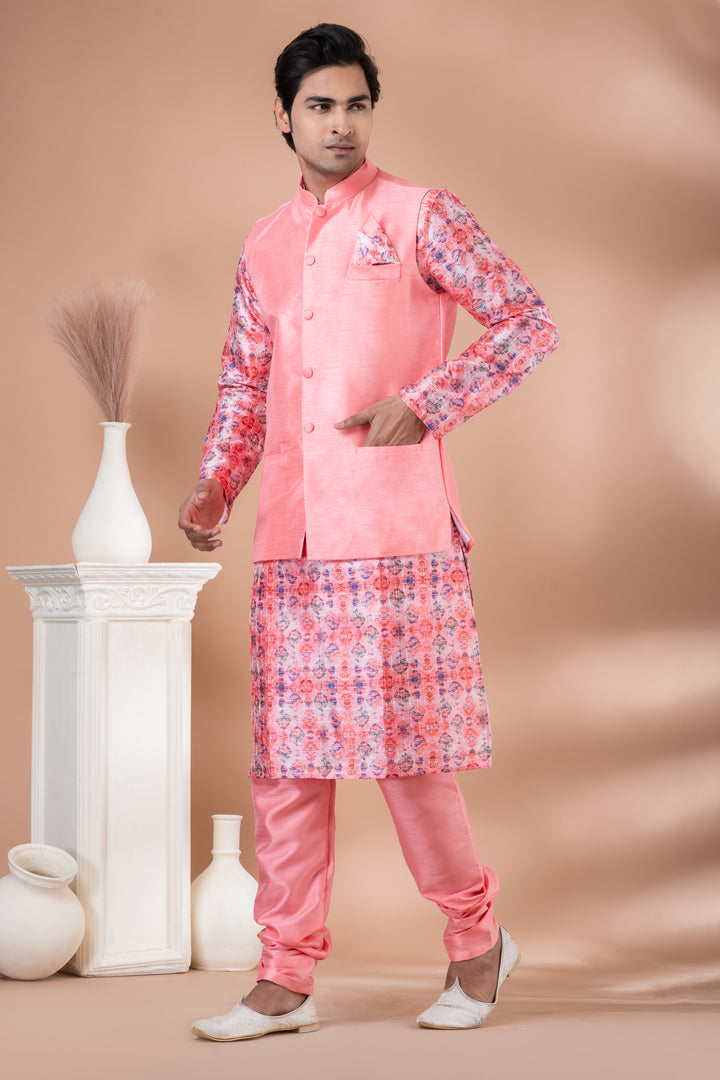 Vibrant and expressive, this Angasudha ensemble is a celebration of color and culture. It features a multicolor printed silk kurta with matching designs on the sleeves, adding a joyful artistic flair. Paired with a coral pink Banarasi silk churidar pyjama, the outfit is completed with a solid Nehru jacket in the same hue, enhanced by tonal buttons and a matching printed pocket square—making it a perfect pick for stylish day events.