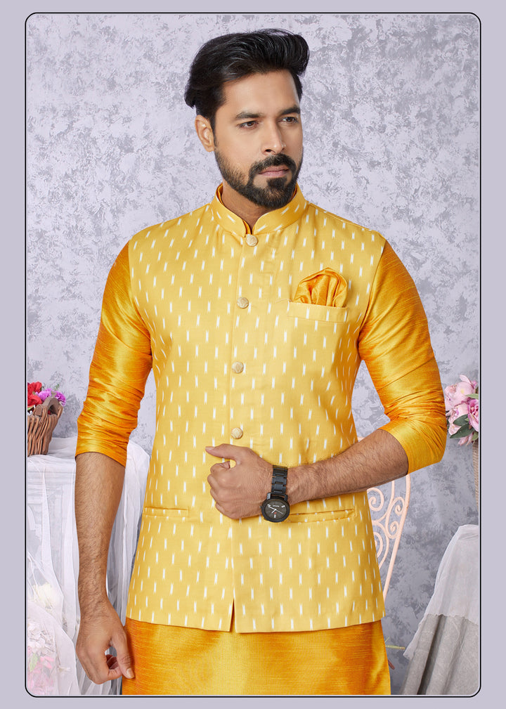 Brighten up your festive wardrobe with the radiant charm of the Angasudha Mustard Kurta Set, paired with a subtle yet stylish Ikat-Inspired Digital Print Waistcoat. The jacket features vertical dash patterns in white over a warm mustard yellow backdrop, exuding minimal elegance with a contemporary ethnic vibe.