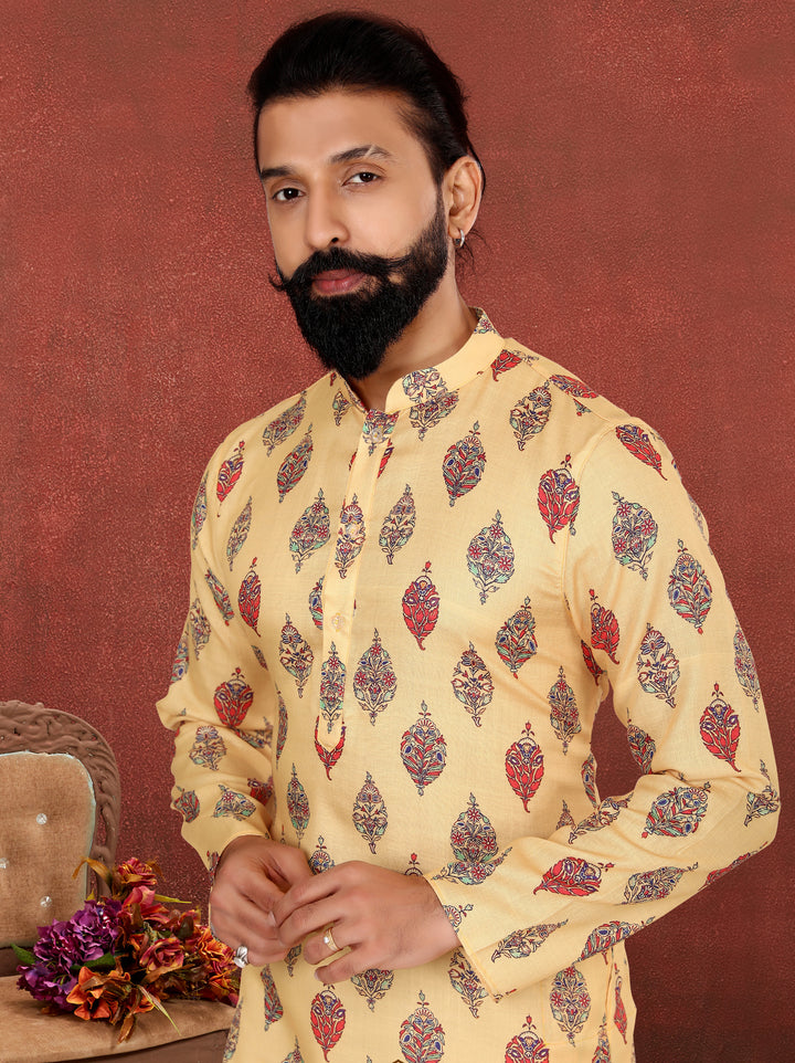 Make a bold ethnic statement with this vibrant mustard yellow kurta, adorned with eye-catching multicolor traditional motifs. Crafted in breathable cotton fabric, the kurta brings together festive flair and day-long comfort. The intricate patterns paired with a clean white Dupion silk pyjama make it a standout pick for daytime celebrations and festive moments.