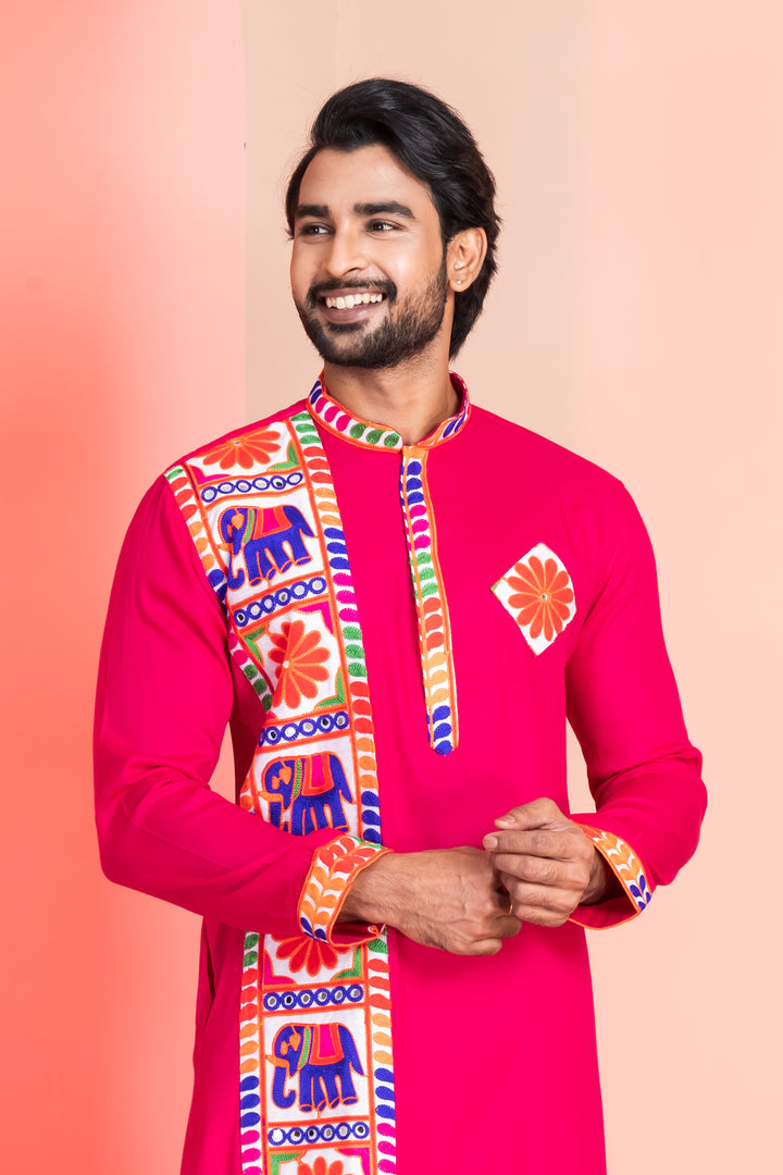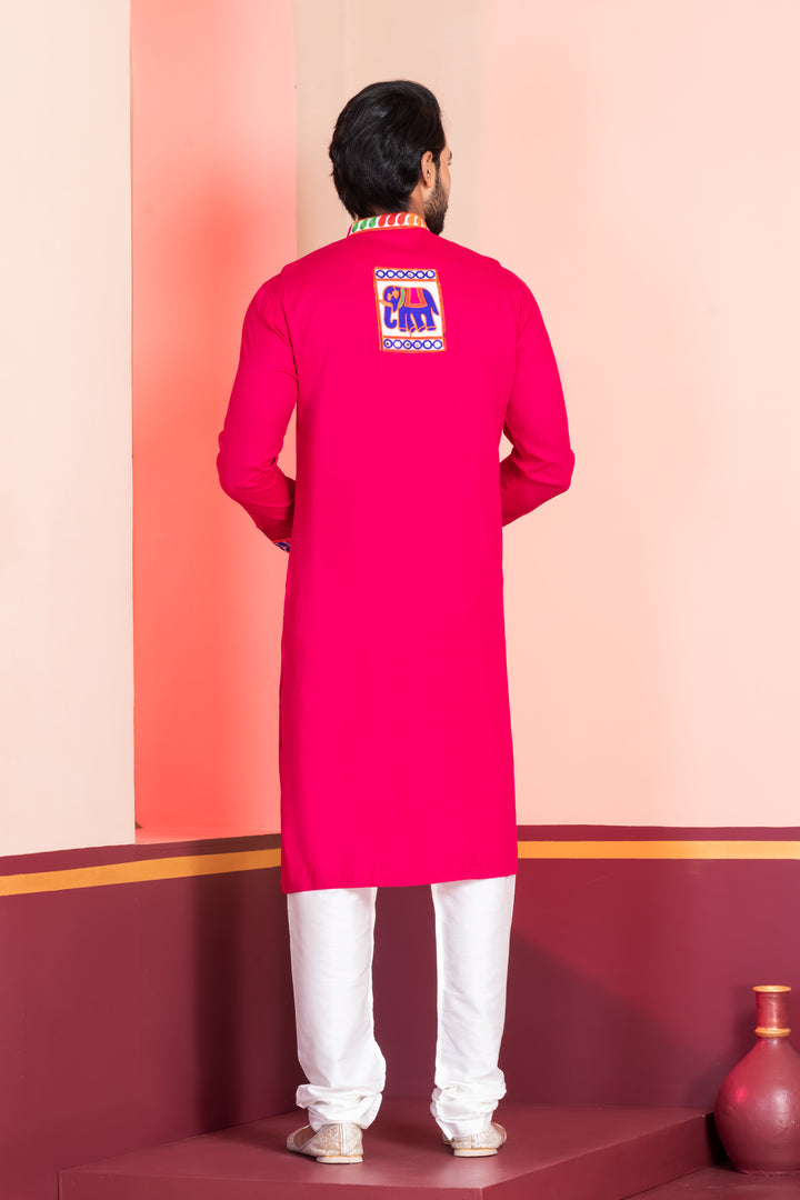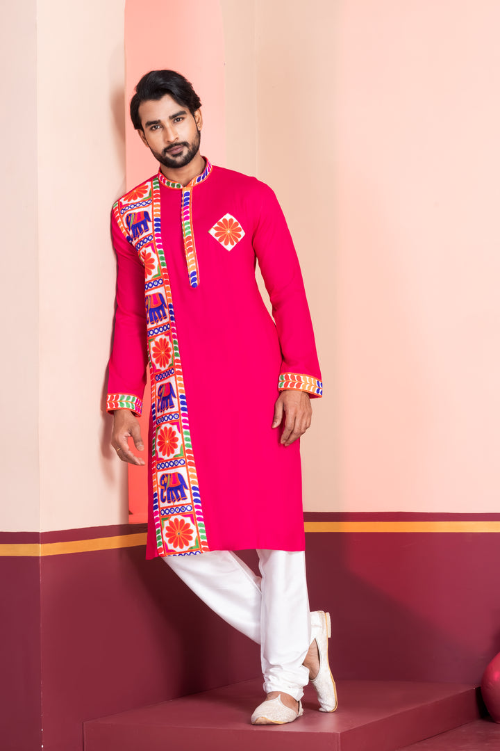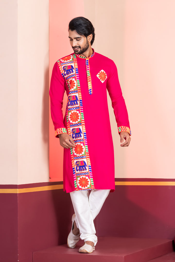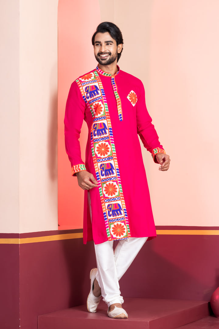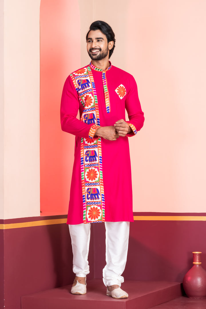 Add a pop of festive elegance to your wardrobe with the Angasudha Rani Pink Kurta Pyjama Set, a bold and refreshing choice for this Navratri season. Tailored in premium rayon fabric, this kurta features colorful, traditional embroidery inspired by Gujarat's rich folk heritage. The lively pink hue, balanced with a classic white viscose pyjama, makes it perfect for high-energy dandiya nights.