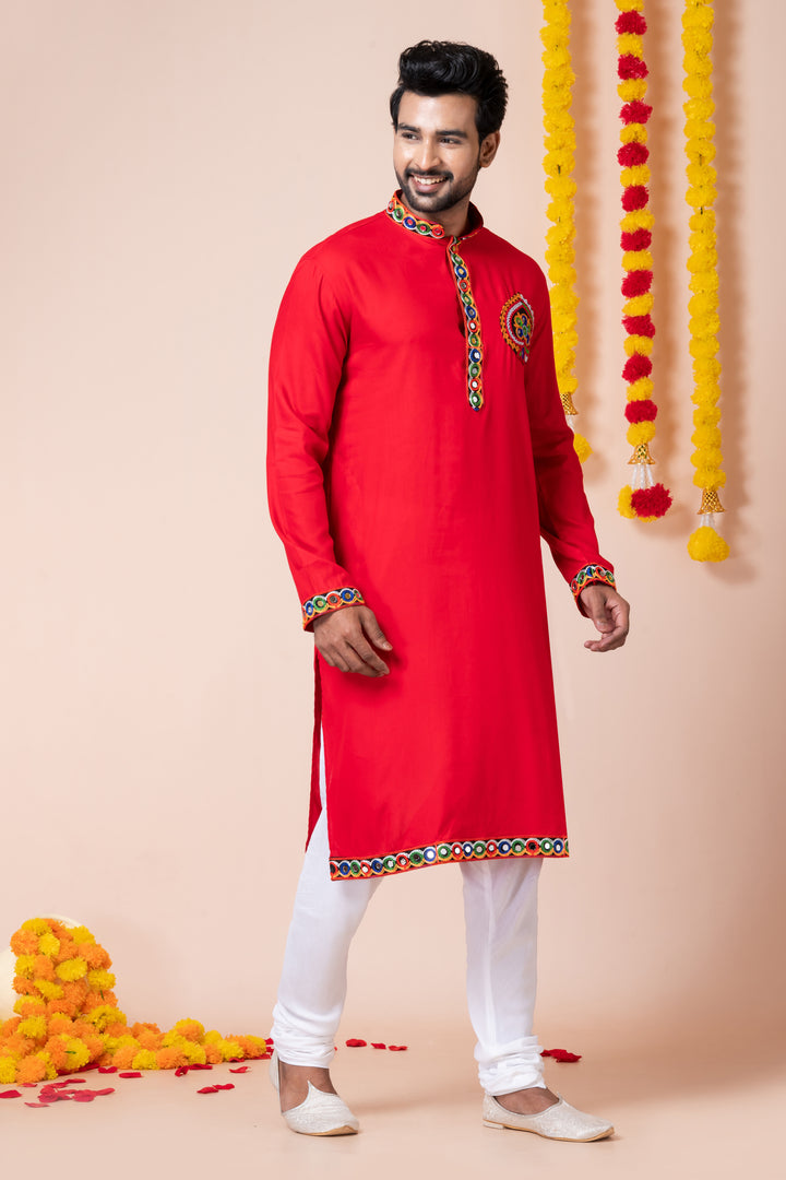 Celebrate the vibrancy of Navratri with this bold red Kurta Pyjama set from Angasudha. Crafted from lightweight and breathable rayon fabric, the kurta features rich machine embroidery, patch work, and lace detailing across the placket, cuffs, hemline, and chest motif. The striking multicolor embroidery on the classic red base gives it an eye-catching festive appeal, perfect for Dandiya nights and traditional celebrations.