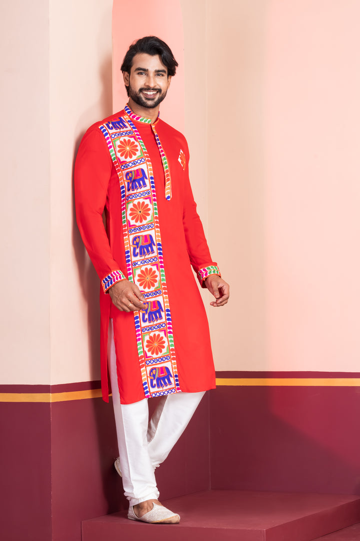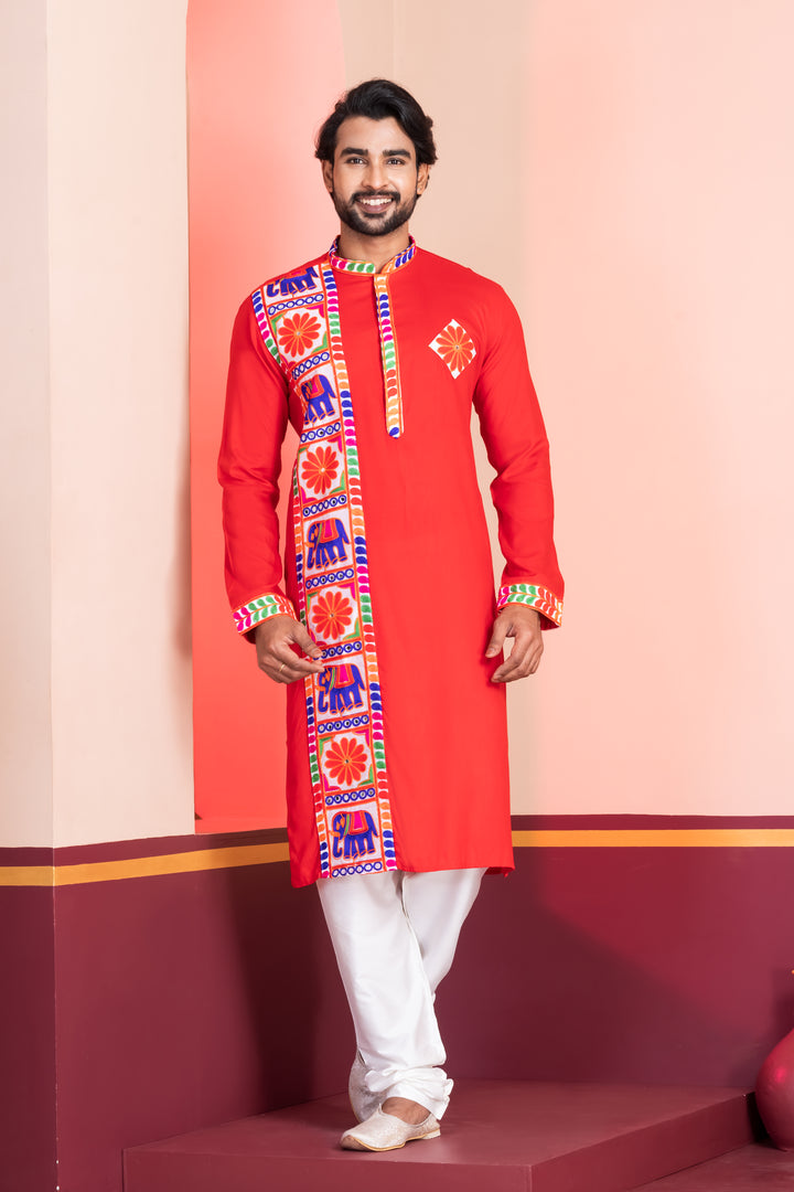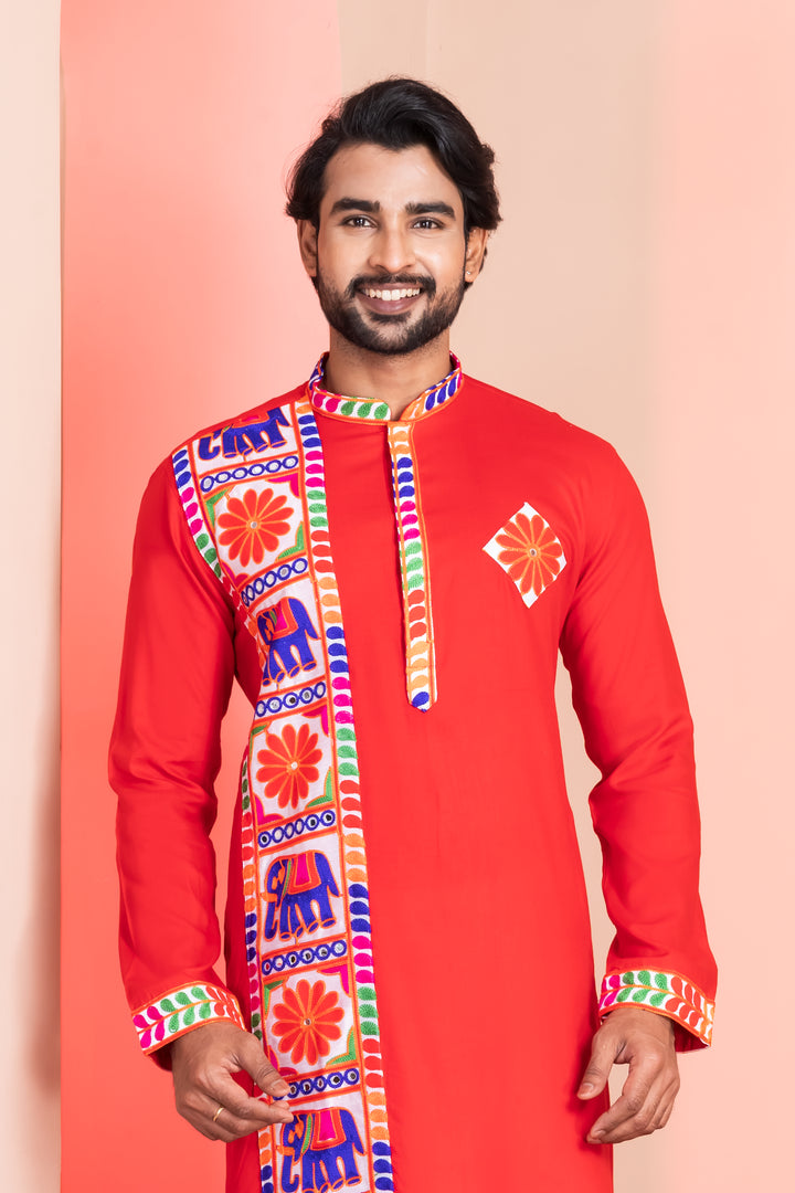 Turn heads this festive season with the striking Angasudha Red Kurta Pyjama Set, designed to embody the energy and vibrancy of Navratri. Crafted from fine rayon fabric, the kurta bursts with colorful threadwork, showcasing traditional Gujarati embroidery that celebrates cultural roots with a modern edge. The crisp white viscose pyjama adds balance and sophistication.