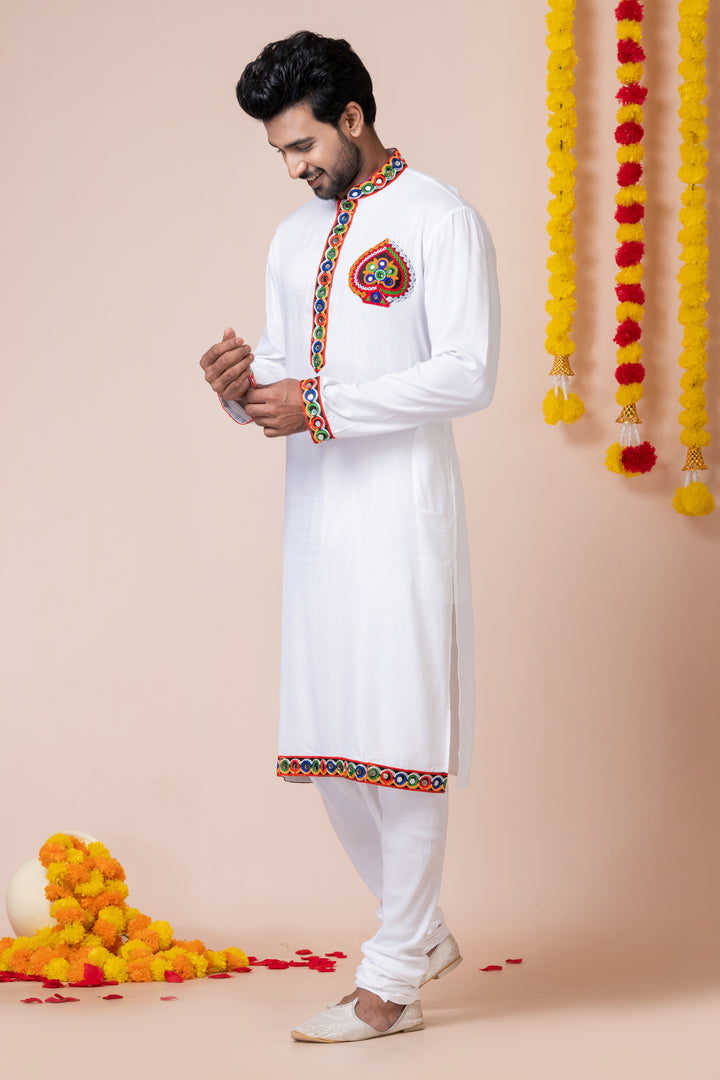 Celebrate the vibrant spirit of Navratri in style with this elegant white Kurta Pyjama set from Angasudha. Crafted from soft, breathable rayon fabric, it features stunning multicolor machine embroidery, patch work, and lace detailing inspired by traditional Gujarati motifs. The colorful accents at the collar, placket, cuffs, and hemline perfectly capture the festive mood, while the minimal white base adds a refined touch.