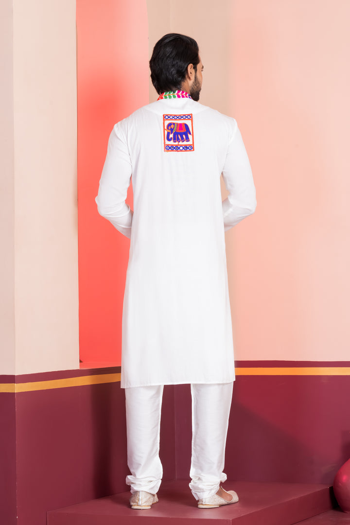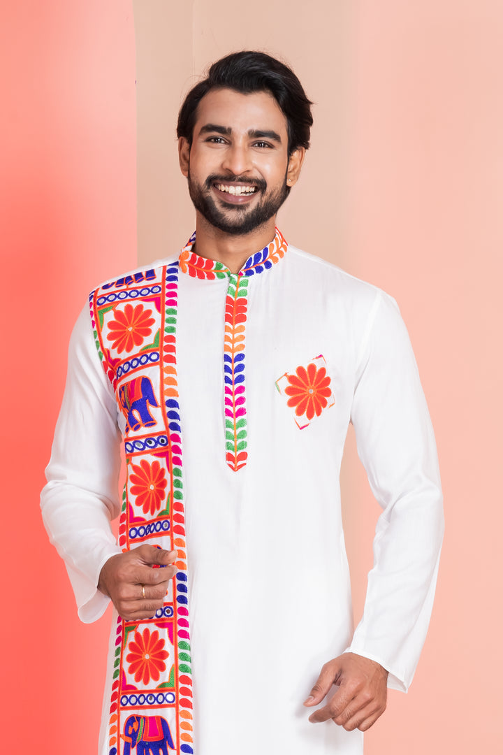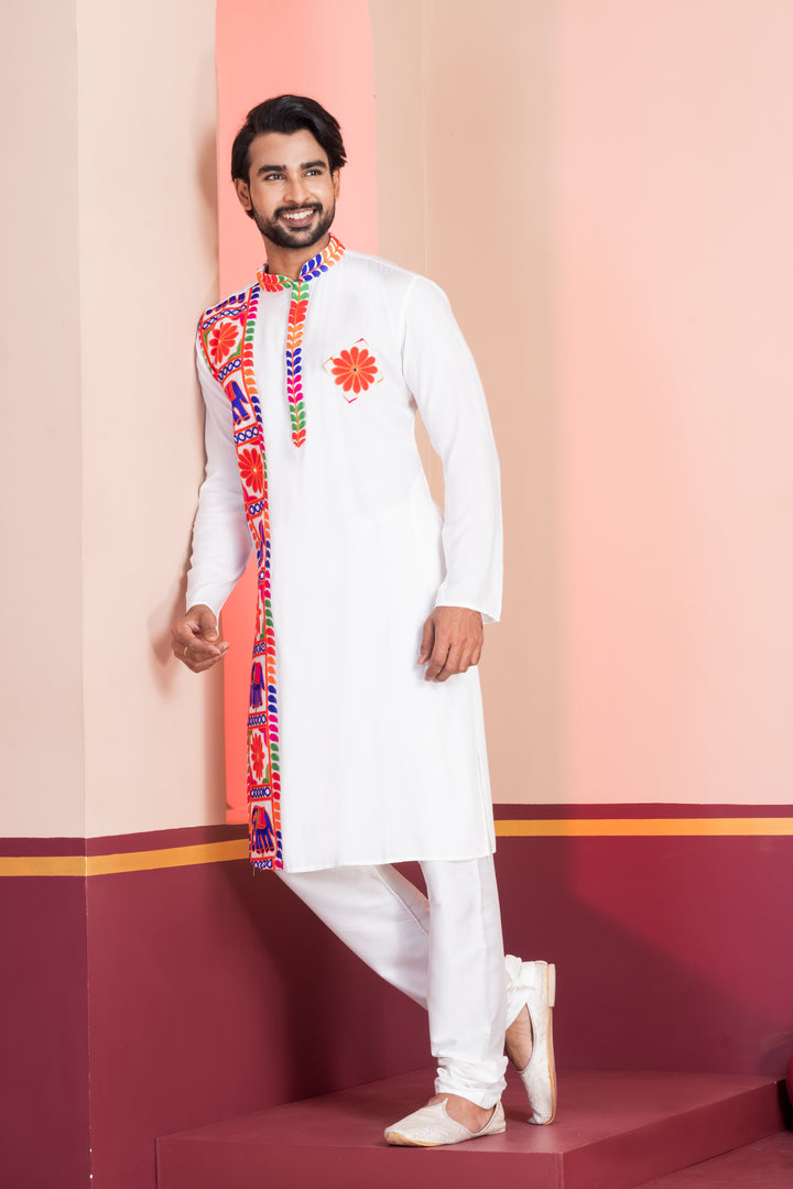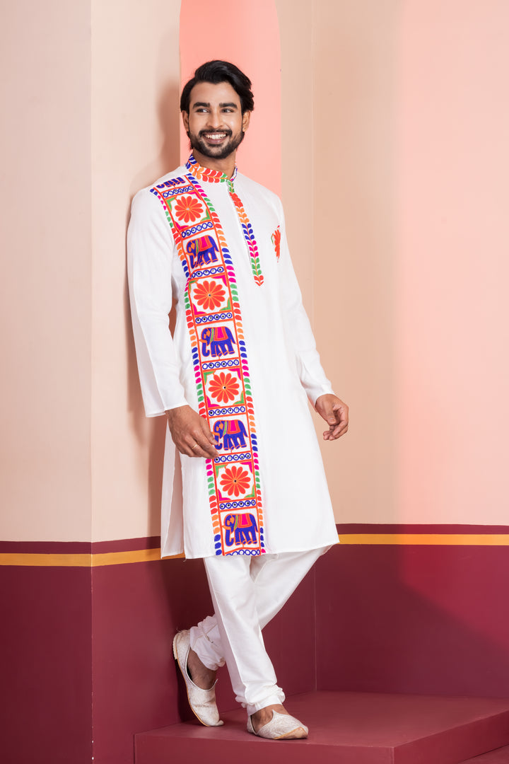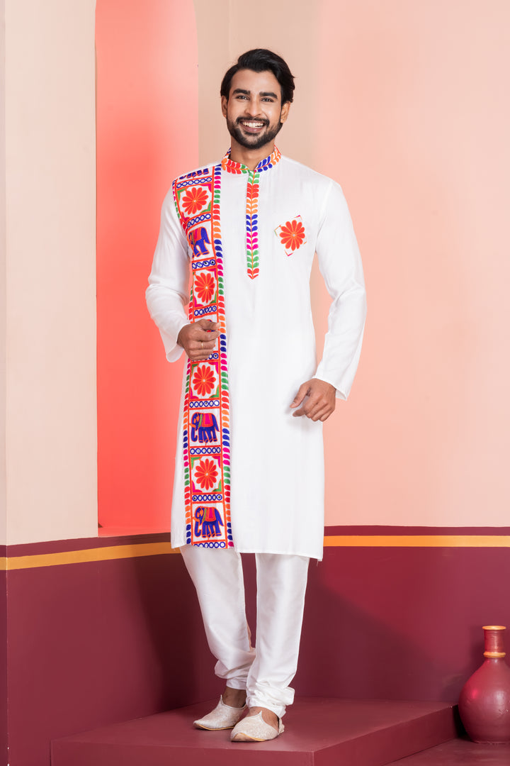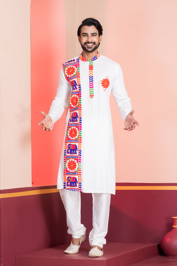 Step into the festive spirit with this radiant Angasudha White Kurta Pyjama Set, designed especially for Navratri celebrations. Made from premium rayon fabric, the kurta offers breathable comfort and graceful drape, paired with viscose pyjama for a smooth and elegant silhouette.