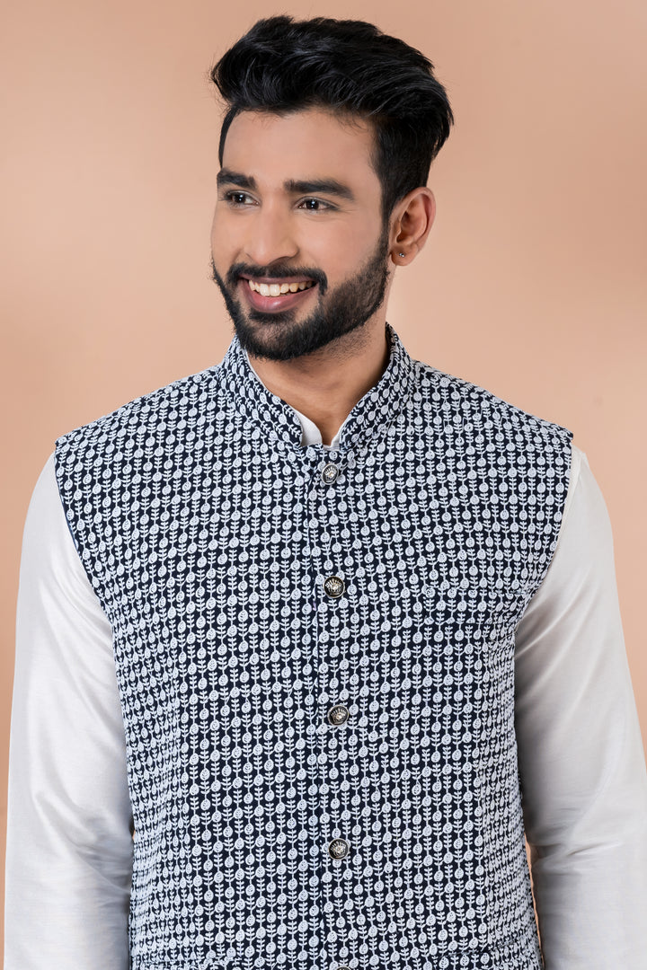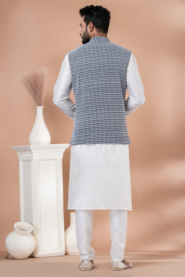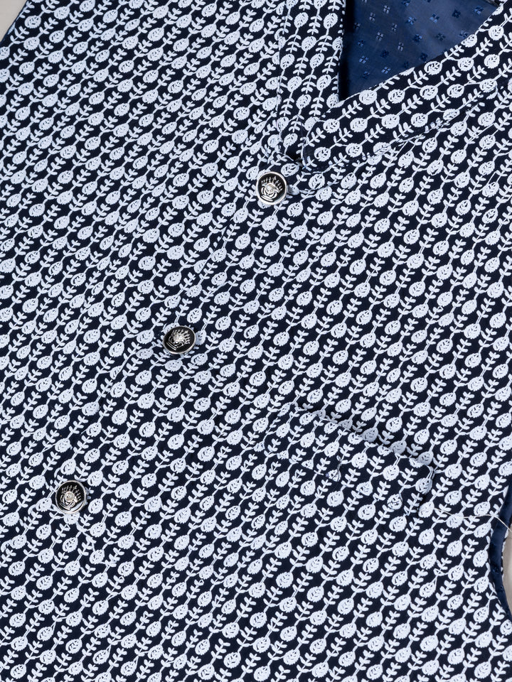 Angasudha Navy and White Geometric Textured Waistcoat with White Kurta Pyjama Set