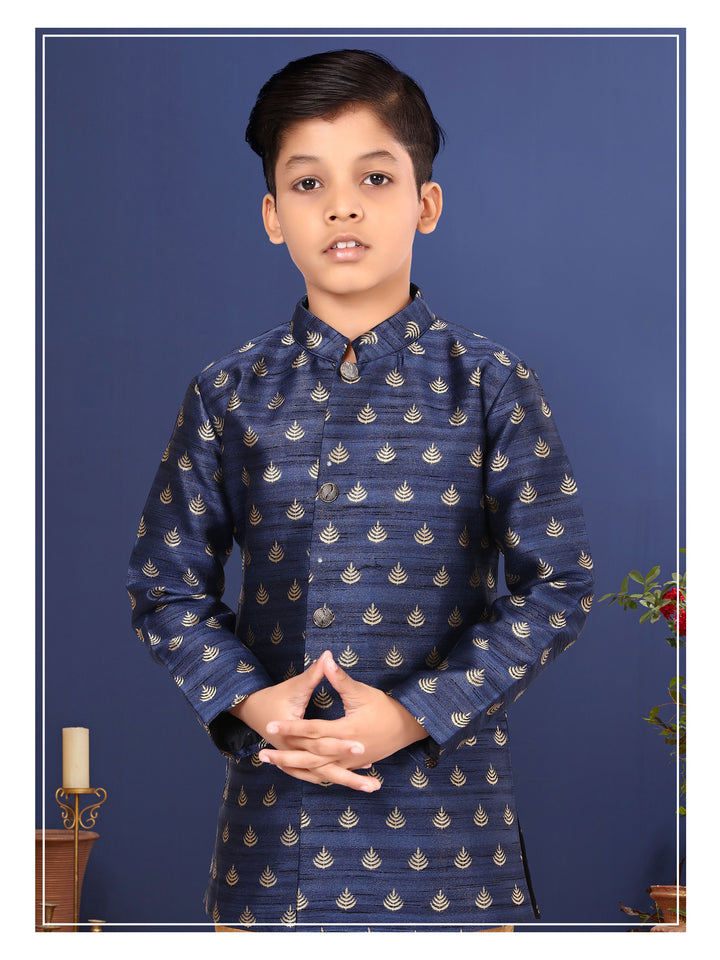 Angasudha Navy Blue Brocade Kurta with Golden Churidar Pants – Boys' Elegant Festive Set