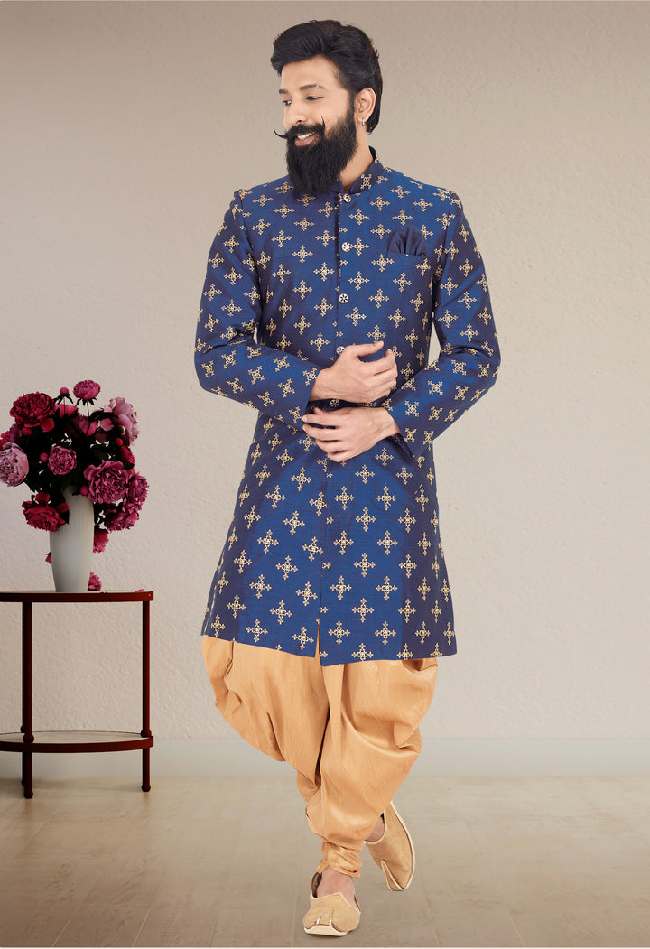 Drape yourself in royal charm with this stunning Angasudha Indo Western set, featuring a rich navy blue top with all-over golden motif embroidery. The elegant design is paired with a gold dhoti pant to add a regal flair, perfect for the modern groom or festive showstopper. With classic button detailing and a refined mandarin collar, this ensemble makes a powerful statement.