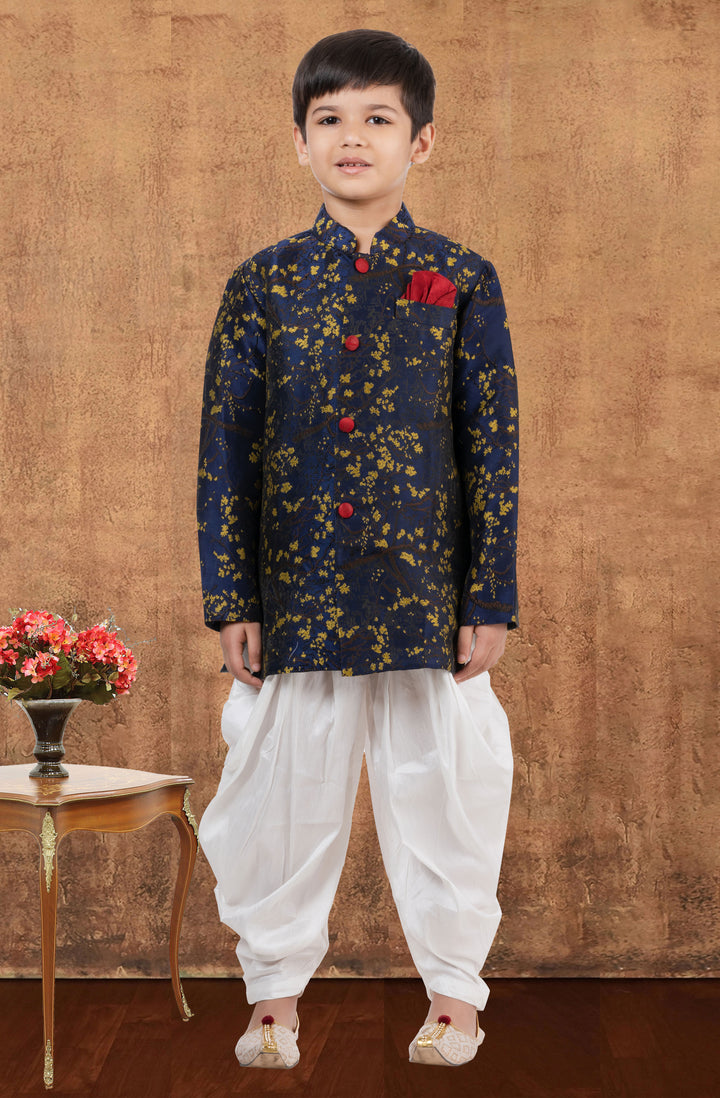 Let your young one make a royal impression with our Navy Blue Jacquard Silk Kurta and White Dhoti Pants Set. Crafted from luxurious jacquard silk, the kurta is beautifully adorned with intricate golden floral patterns, highlighted by striking red buttons and a smart red pocket square for a bold festive look. The straight-cut silhouette and mandarin collar enhance the traditional yet stylish vibe. Paired with soft and pleated white cotton-blend dhoti pants, this set offers unbeatable comfort with a majestic appearance.