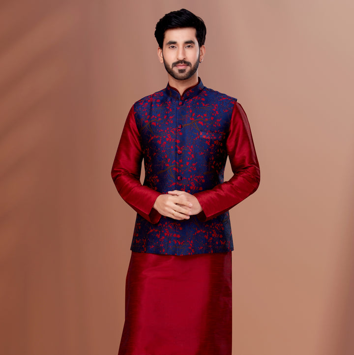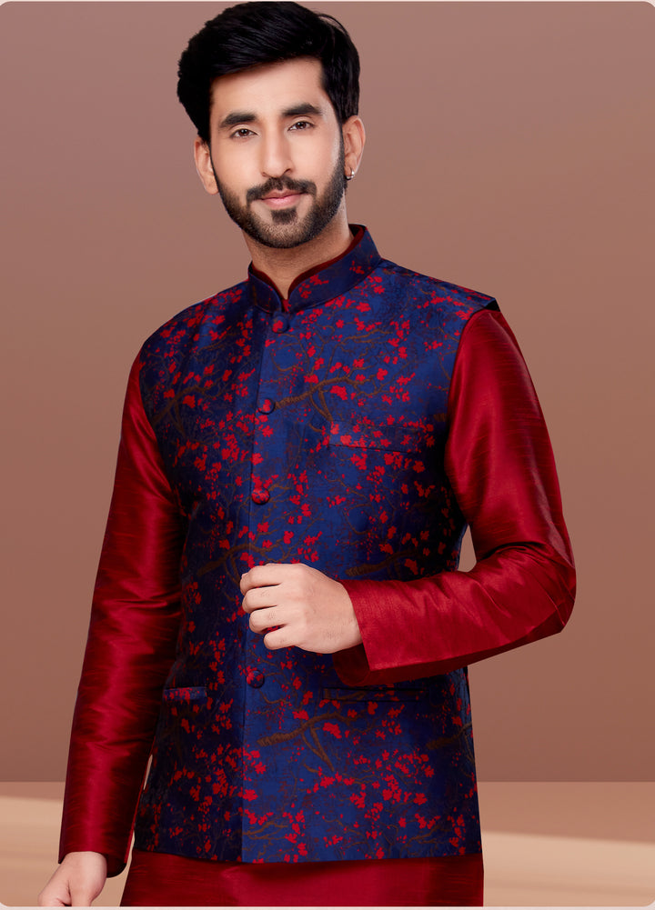 Elevate your ethnic ensemble with this stunning Navy Blue and Maroon Floral Brocade Waistcoat, designed for the modern gentleman with a regal taste. Crafted from rich silk-blend brocade, this waistcoat features an intricate floral weave in vibrant maroon set against a deep navy backdrop — a combination that exudes opulence and timeless charm.