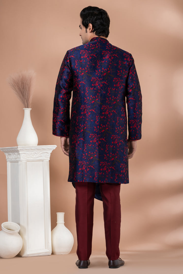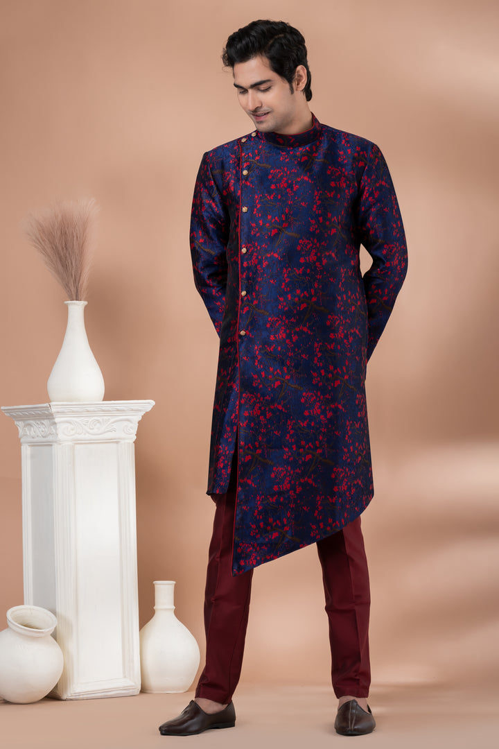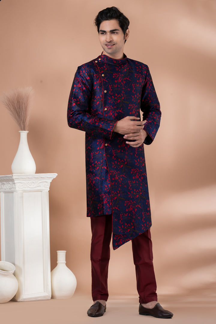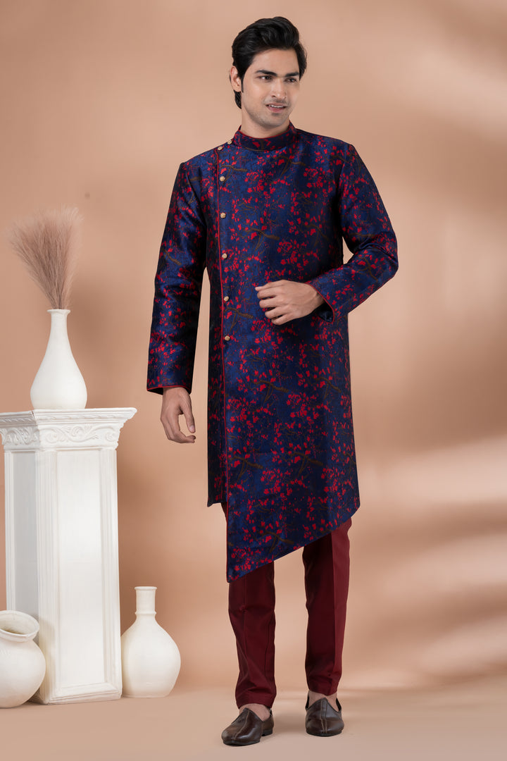 Make a powerful fashion statement with this Navy & Maroon Asymmetric Indo-Western Set, crafted for men who dare to stand out with refined elegance.