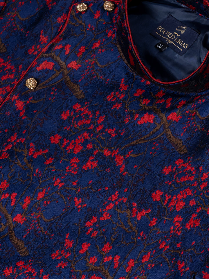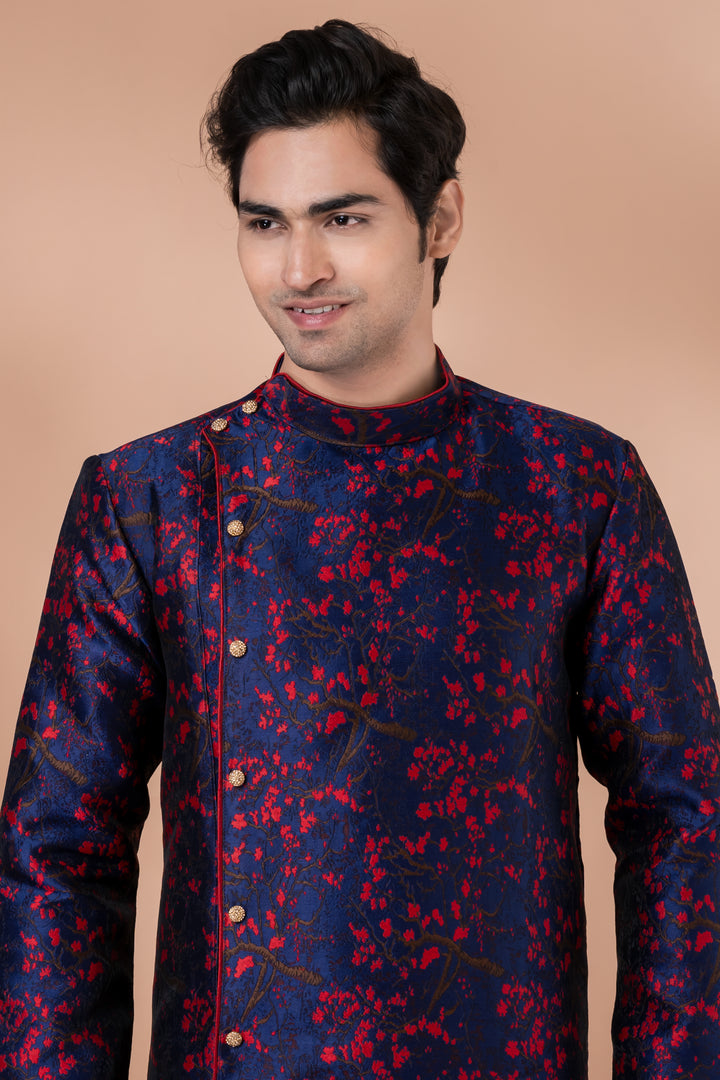 Top Fabric: Navy Blue Banarasi Jacquard Kurta with vivid red floral patterns, exuding rich texture and royal energy.