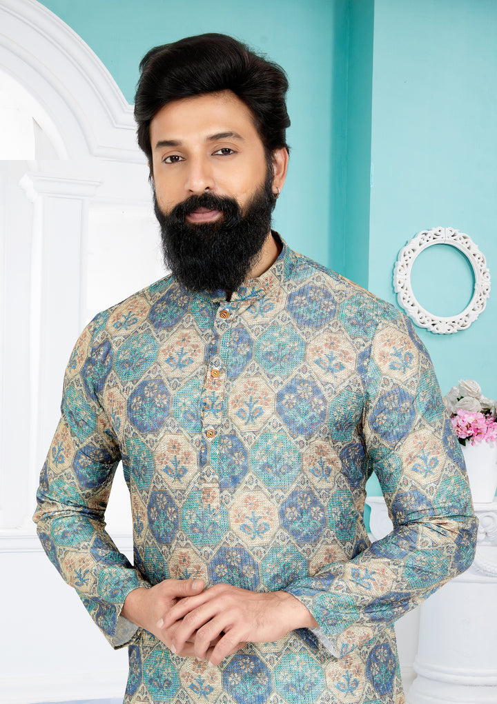 Step into royal elegance with this Blue-Green Mughal Motif Kurta, showcasing intricate digital prints that reflect the grandeur of Persian-inspired patterns. Crafted on textured mono fabric and paired with a white Dupion Silk Pyjama, this ensemble delivers opulence with contemporary ease.