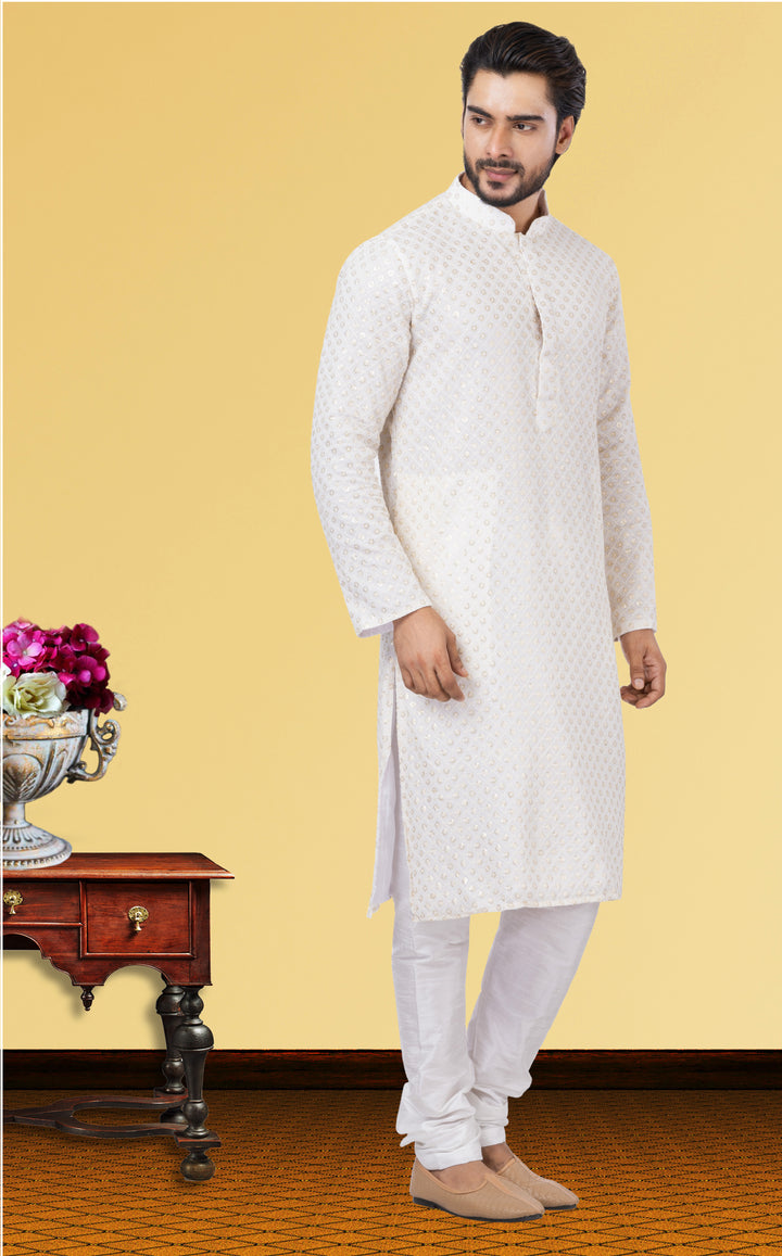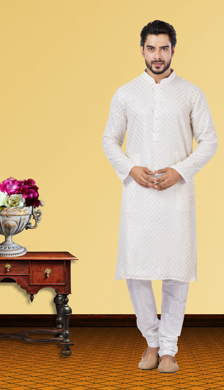 Classic elegance finds its perfect match in this off-white Angasudha kurta set. Adorned with delicate diamond-shaped mirror embroidery, the subtle shimmer adds just the right amount of festive flair. Paired with a white dupion silk pyjama, this ensemble is perfect for sacred events and serene celebrations.