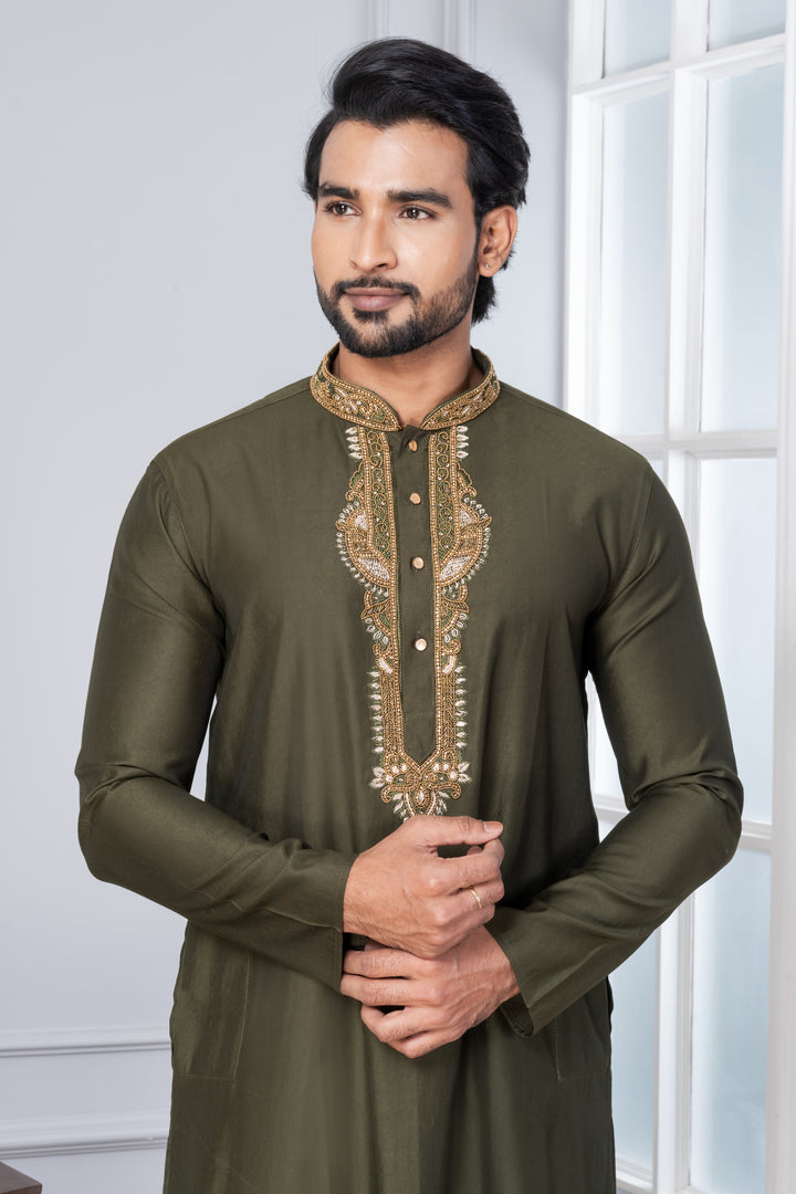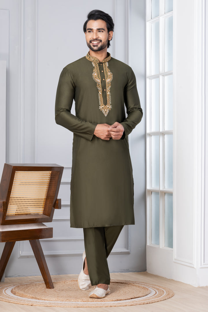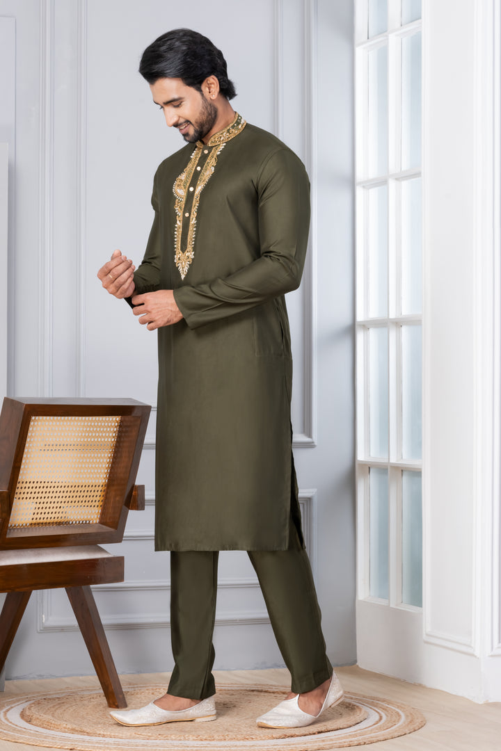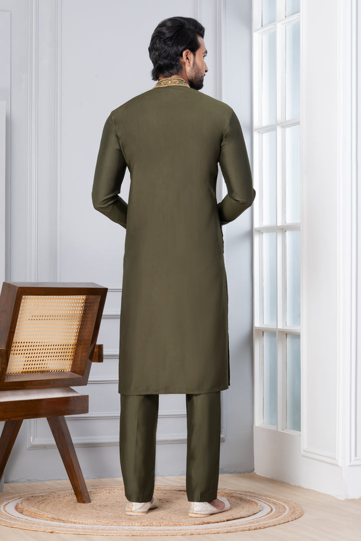 Bring a royal touch to your ethnic wardrobe with this Olive Green Glam Cotton Kurta Pyjama Set, designed with rich detailing and timeless elegance.