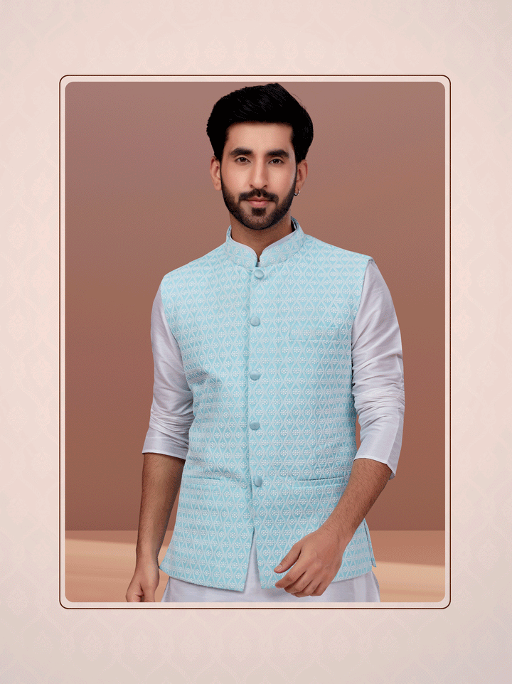 Refined and graceful, this pastel blue Nehru jacket set from Angasudha speaks elegance. Crafted in rich brocade fabric with traditional self-weaving patterns, the waistcoat brings a subtle charm to the pristine white kurta and churidar pyjama. This outfit effortlessly blends tradition with a fresh, modern palette—perfect for daytime festivities or wedding rituals.