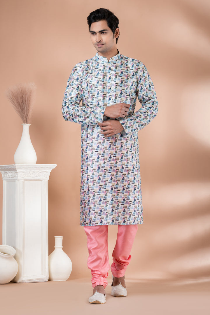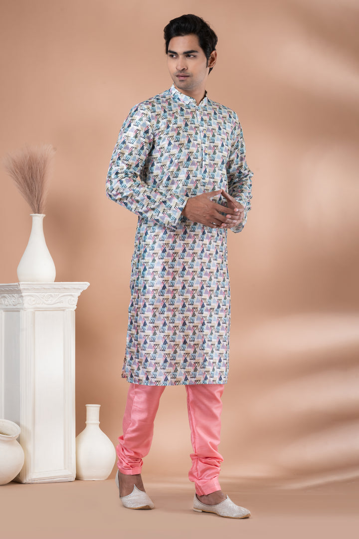 Paired with a soft peach pink Dupion Silk Pyjama, this ensemble is perfect for festive day events, family gatherings, or a stylish ethnic brunch. The playful color contrast and breathable fabric make it both fashionable and functional.