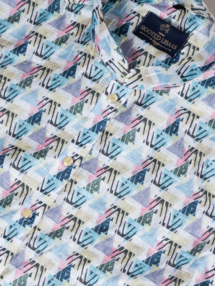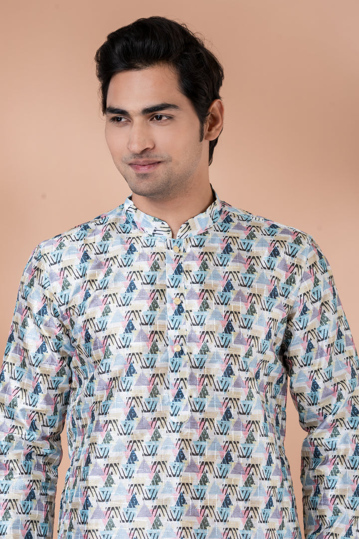 Brighten up your ethnic collection with the Angasudha Pastel Prism Kurta Set, a lively blend of tradition and contemporary finesse. This kurta is made from lightweight Mono Fabric, designed with a vibrant digital geometric print and enhanced by fine crochet detailing for added texture and elegance.