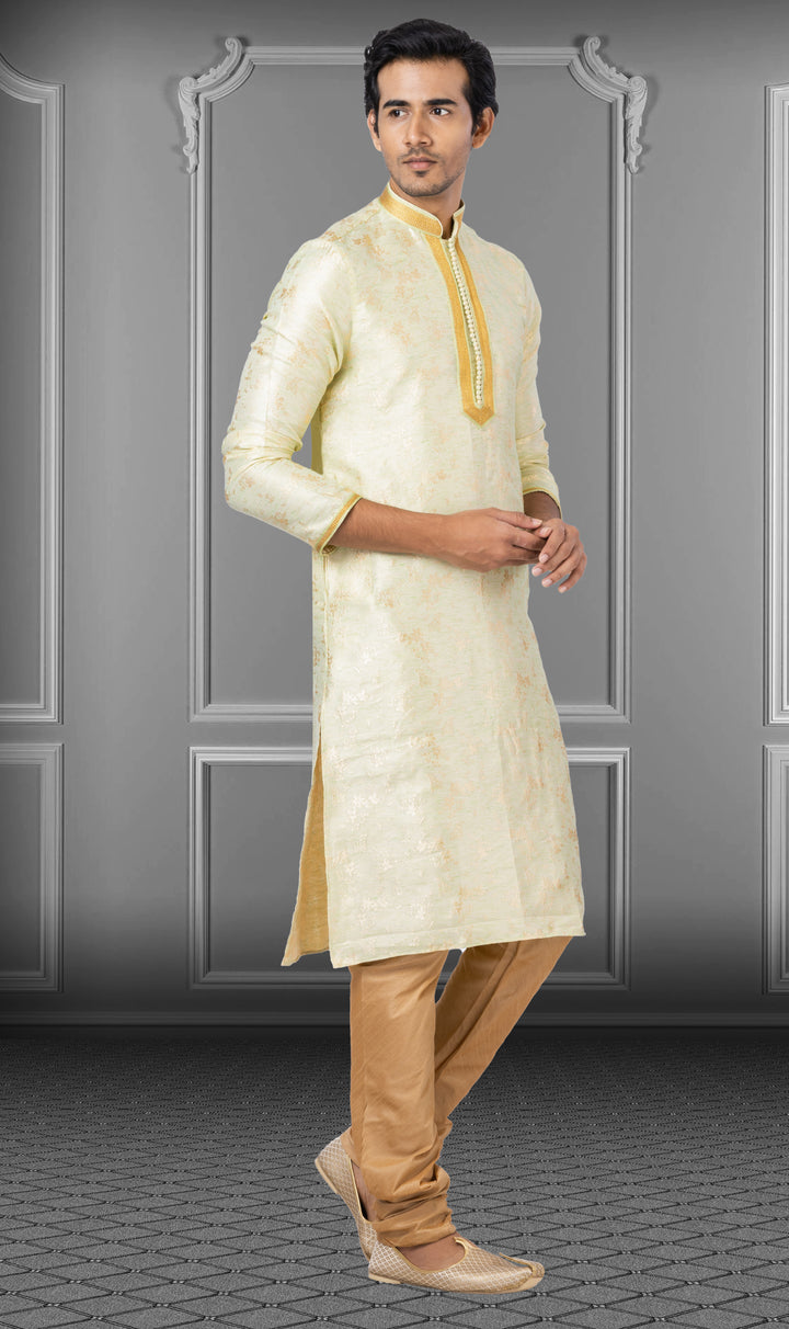 Paired with a beige Dupion silk pyjama, this ensemble is ideal for morning functions, haldi ceremonies, summer weddings, or cultural events. Its soft hue and premium finish make it a refined choice for men who prefer elegance with ease.
