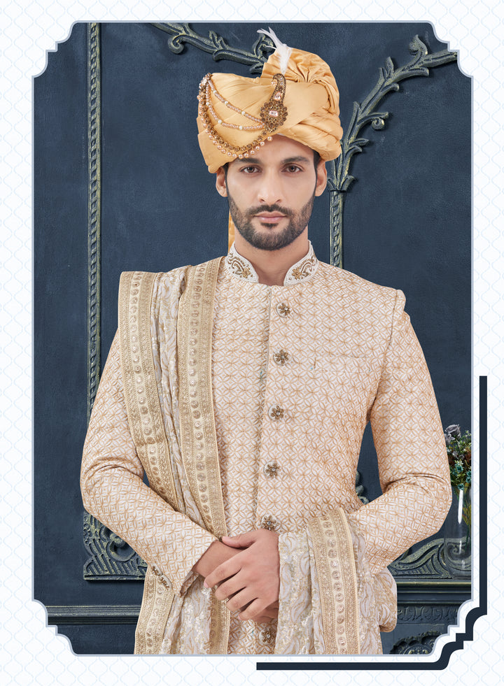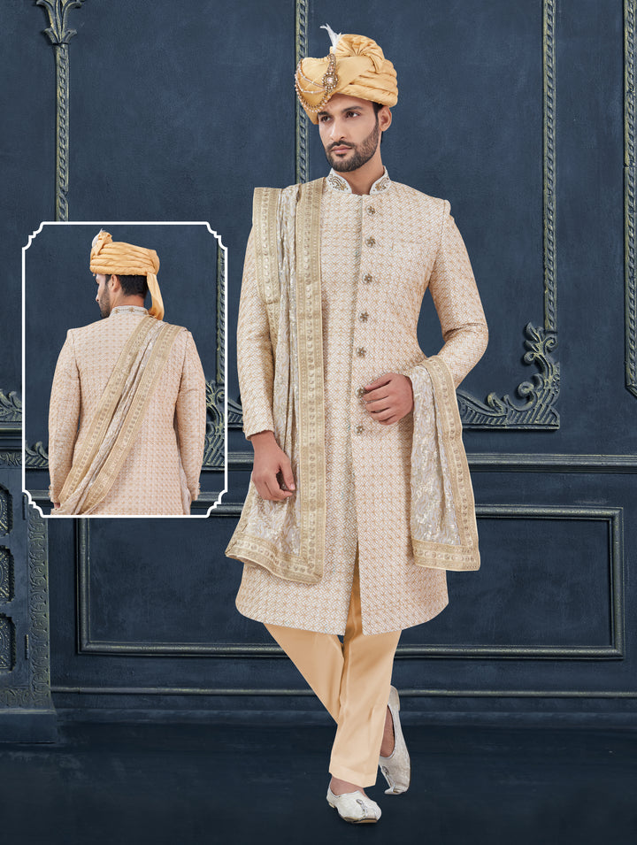 Paired with warm beige trousers, a richly bordered golden dupatta, and a striking saffron-gold turban with brooch detail, this ensemble is made for weddings, receptions, and grand festive affairs. This sherwani is your key to looking regal with effortless style.