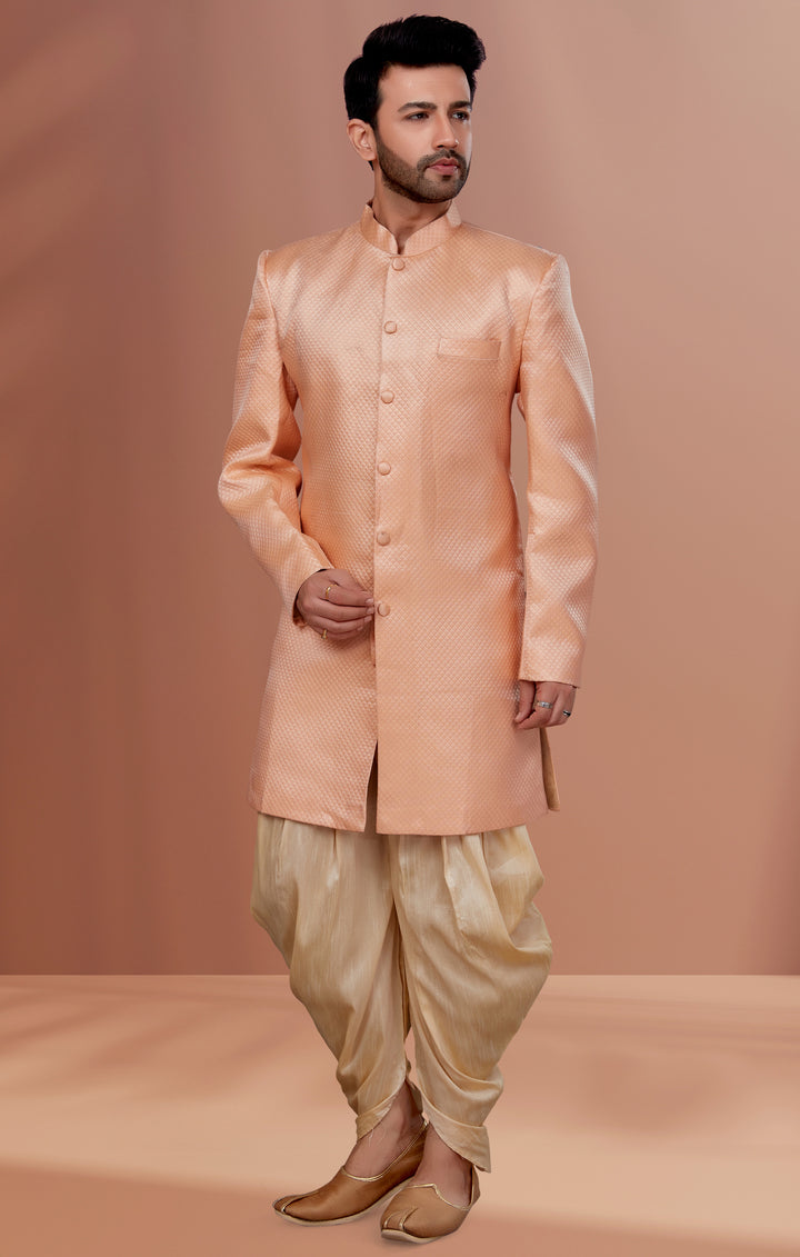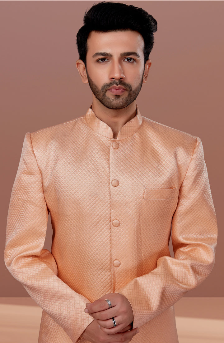 Channel graceful charm with the Angasudha Peach Opulence Sherwani Set, a perfect pick for day weddings and cultural celebrations. Subtle yet striking, this ensemble speaks of refined taste and ethnic grandeur.