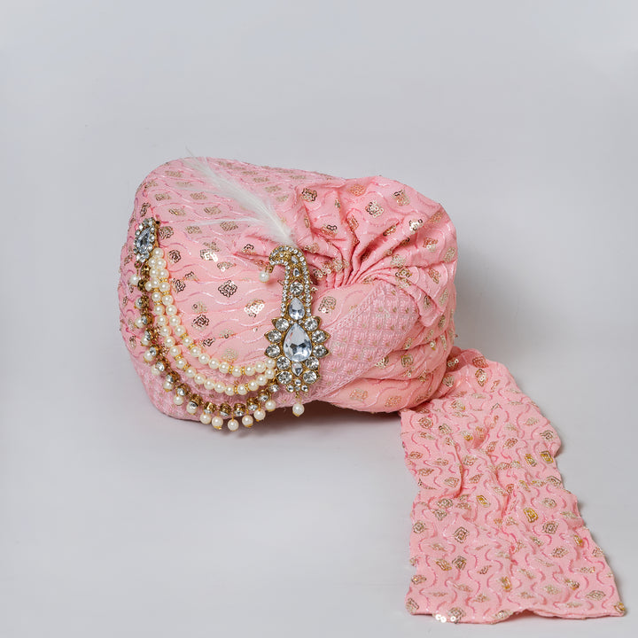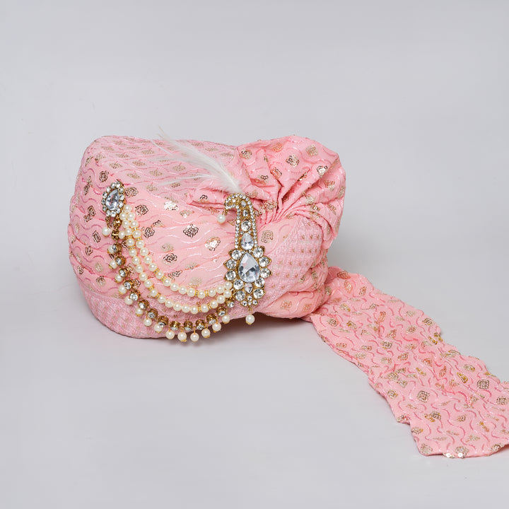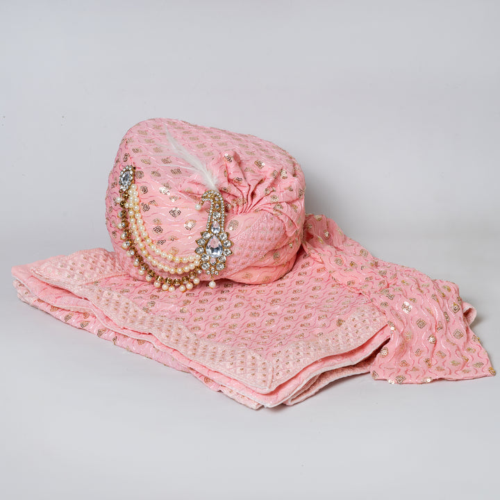 Angasudha Peach Sequin Groom Pagdi with Pearl & Crystal Brooch and Embellished Stole