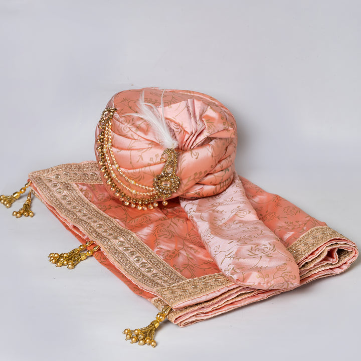 Angasudha Peach Silk Floral Groom Pagdi with Embroidered Stole & Beaded Brooch