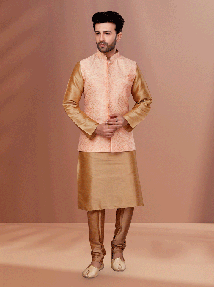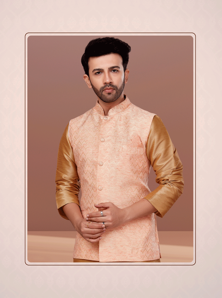 A perfect blend of softness and style, this peach and gold Angasudha ethnic set brings out modern elegance with a traditional flair. The sleeveless peach waistcoat features delicate woven chevron motifs and a subtle sheen, while the glossy golden kurta pyjama adds depth and richness to the overall look. Ideal for festive mornings and elegant daytime functions.