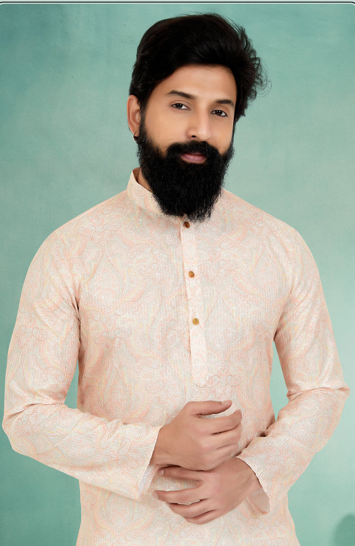 Channel subtle sophistication with this Pastel Peach Kurta, featuring an intricate paisley pattern rendered in delicate tones for a soft, elegant vibe. Styled with a white Dupion Silk Pyjama, this ensemble offers the perfect balance of comfort and modern flair—ideal for daytime functions and minimalist fashion lovers.
