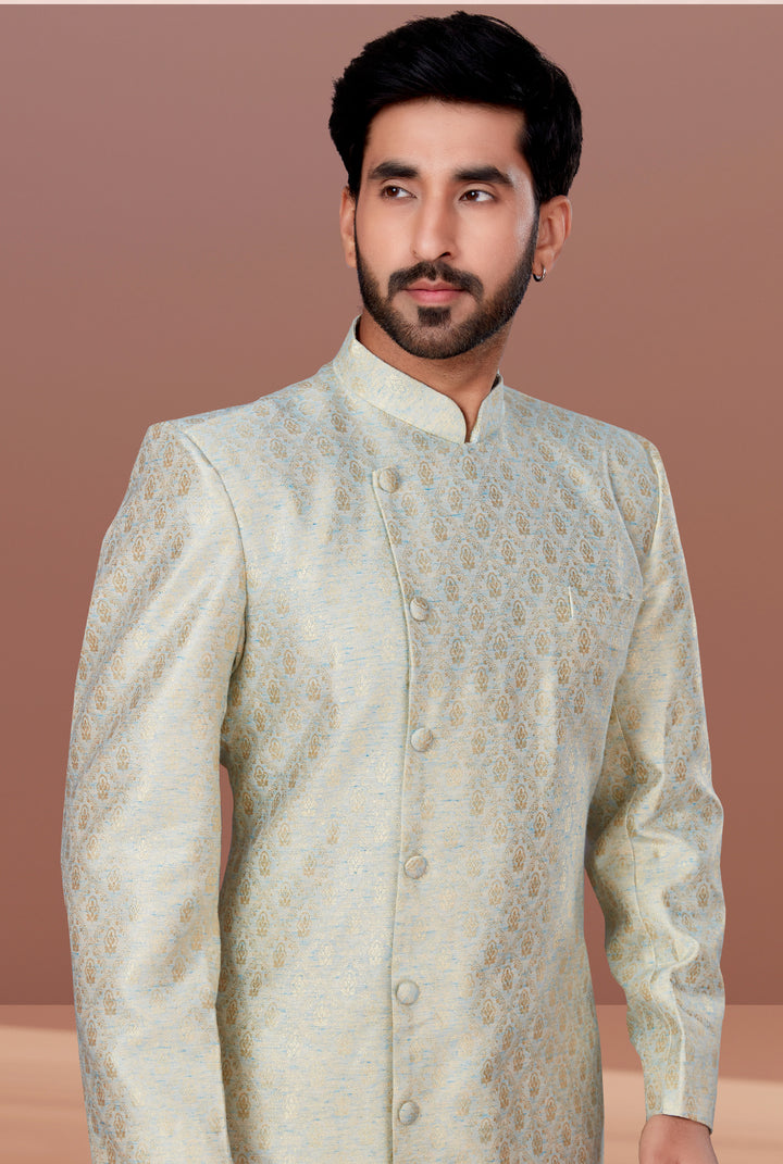 Elevate your ethnic fashion game with this radiant Indo-Western outfit from Angasudha. Featuring a pearl beige jacket with intricate golden jacquard motifs and an overlapping front panel, it pairs beautifully with a lustrous golden dhoti, making it an impeccable choice for ceremonial splendor.