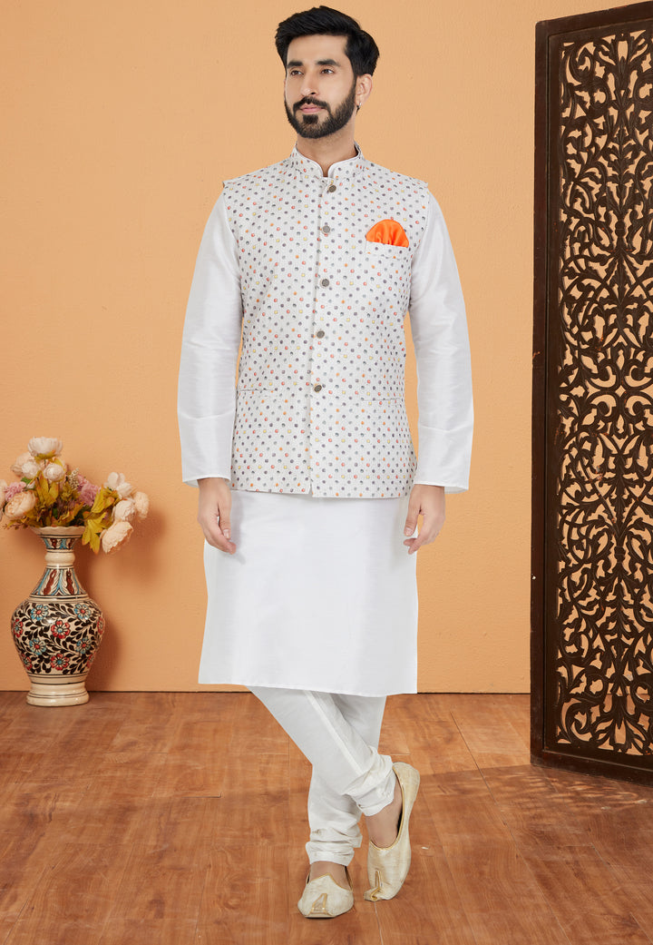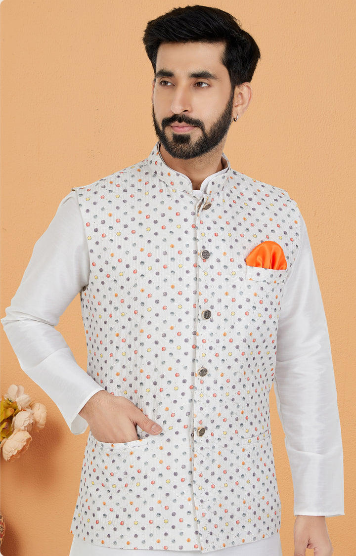 Make a subtle yet sophisticated statement with this white kurta pyjama ensemble paired with a dotted Nehru jacket. The kurta and pyjama are tailored from a soft art silk fabric, providing a gentle sheen and smooth drape. The ivory waistcoat is adorned with multi-color circular motifs and an eye-catching orange pocket square — perfect for adding a playful twist to a classic look.