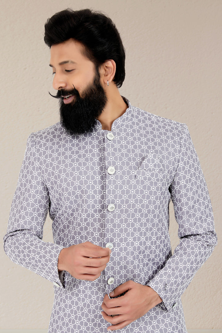 Angasudha Pearl Grey Geometric Jodhpuri Set with Churidar
