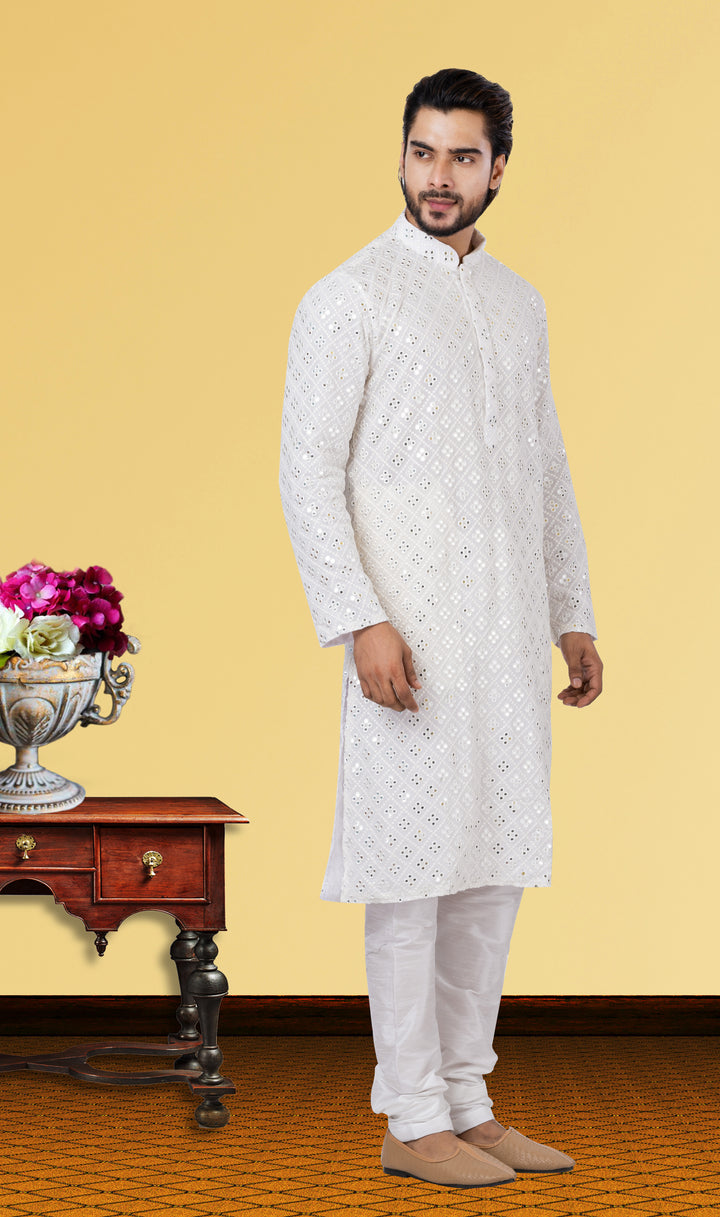 Exude purity and poise with this pearl white kurta set from Angasudha. Showcasing intricate diamond-shaped mirror embroidery on soft georgette, it blends subtlety with festive sparkle. The crisp white dupion silk pyjama completes the look, perfect for spiritual ceremonies or elegant day events.