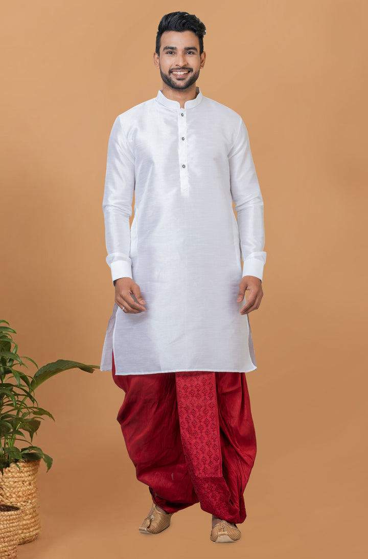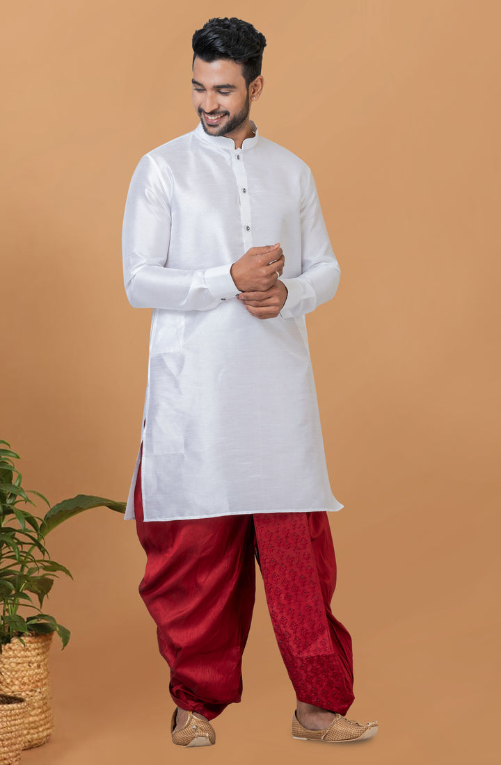 Celebrate tradition with a modern twist in this Pearl White Kurta with Maroon Thread-Embroidered Dhoti. The pristine white kurta features a classic mandarin collar and minimal button placket, offering a clean and elegant silhouette perfect for all age groups.