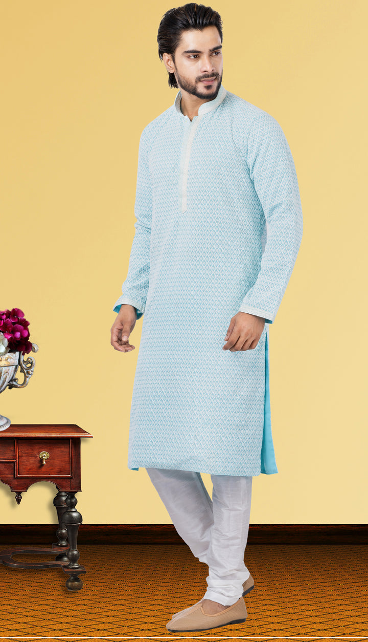 Kurta: Powder Blue Georgette with Self-Design