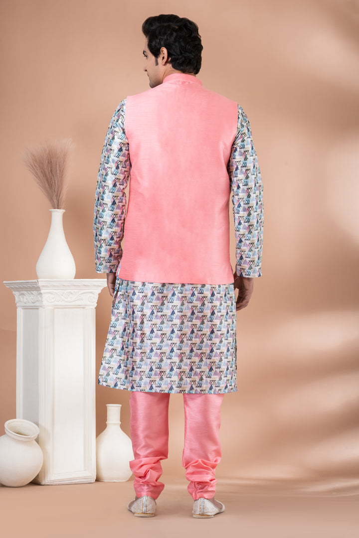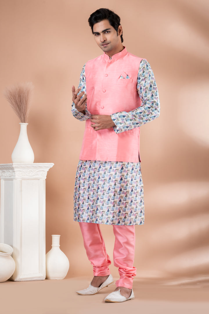 A perfect balance of vibrance and class—this Angasudha outfit is made for the modern festive man. It features a geometric printed silk kurta in refreshing pastel shades, paired with coral pink Banarasi silk churidar pyjama. The look is completed with a solid coral pink Banarasi silk Nehru jacket, neatly tailored with tonal buttons and a printed pocket square—bringing refined energy to festive fashion.