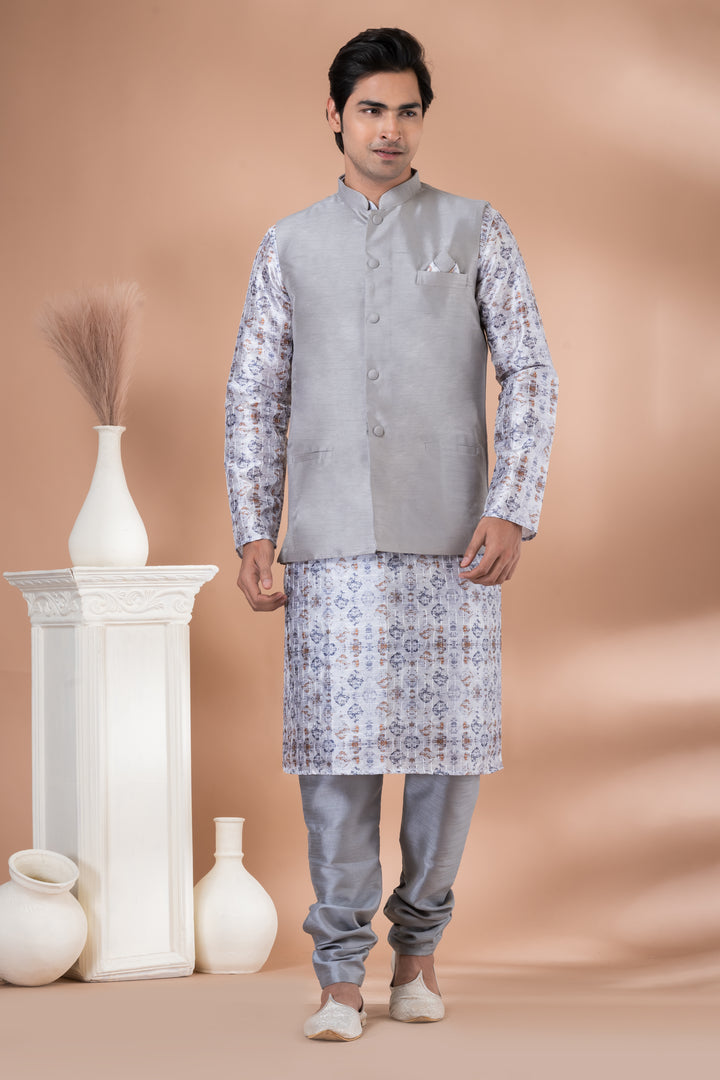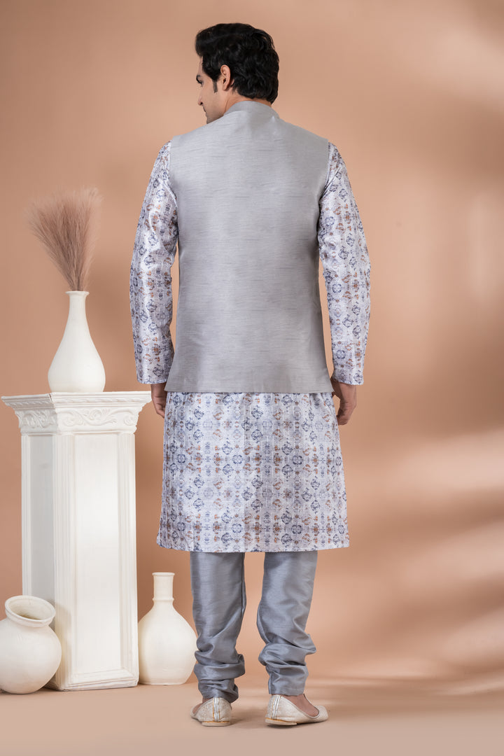 Exude class with a modern twist in this statement ethnic outfit by Angasudha. The set includes a sophisticated printed silk kurta featuring intricate blue and copper motifs paired with matching Banarasi silk churidar pyjama. It is layered with a solid grey Banarasi silk Nehru jacket, adding a sharp, polished touch to the ensemble—ideal for men who appreciate elegance with flair.