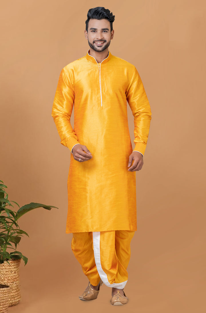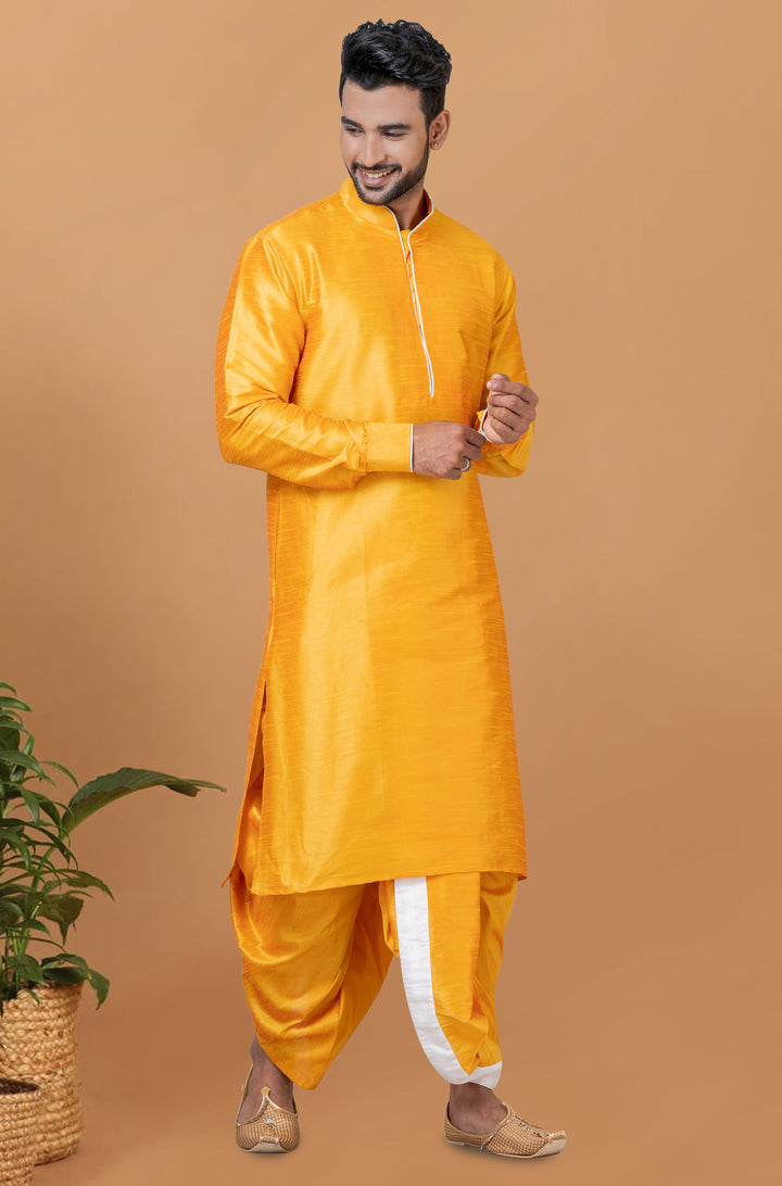 Brighten up every celebration with our Radiant Saffron Dhoti Kurta Set, a vibrant ethnic outfit that speaks of tradition with a refreshing twist. The kurta, crafted in a lustrous silk blend, comes in a striking saffron hue and features a clean mandarin collar and contrast white piping on the neckline and cuffs – a detail that elevates its elegance.