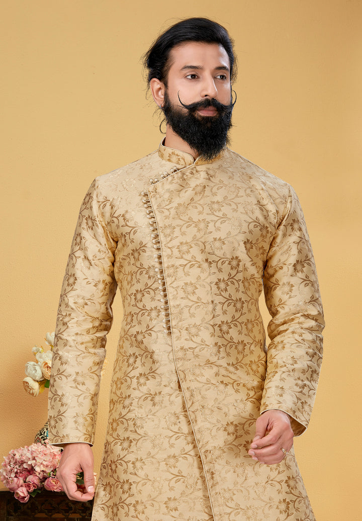 Step into timeless elegance with this luxurious Indo-Western ensemble from Angasudha. Crafted from premium beige Jacquard Silk, the asymmetrical kurta features intricate floral weaving that exudes sophistication. The stylish Chinese collar and diagonal button detailing add a touch of royal charm.