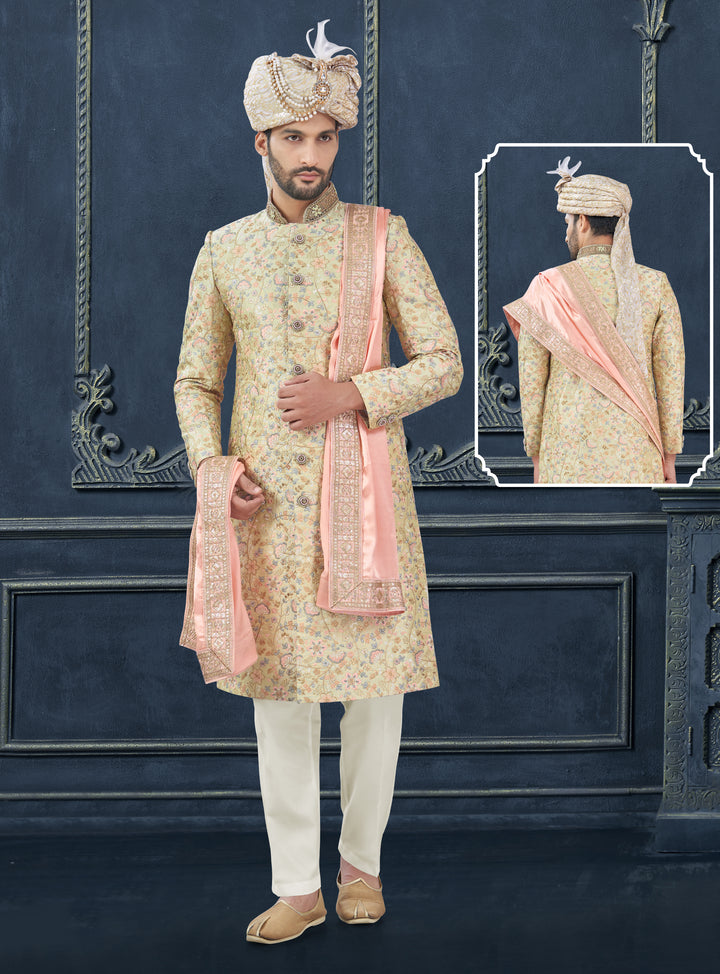 Make a majestic statement on your special day with this Regal Bridal Sherwani Set, crafted for grooms who wish to exude charm, class, and culture. Drenched in a soft pastel tone and adorned with exquisite multicolor floral embroidery, this sherwani is a masterpiece of tradition and trend. The antique-style buttons, detailed dupatta with zari work, and coordinating churidar elevate its elegance—making it ideal for bridal wear, wedding ceremonies, receptions, or royal-themed engagements.