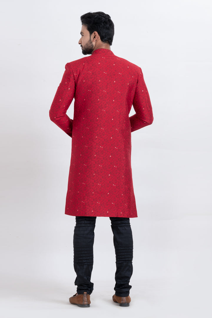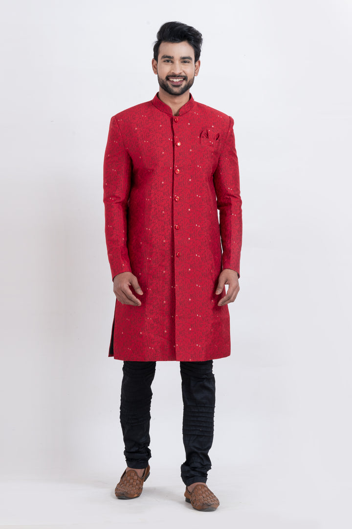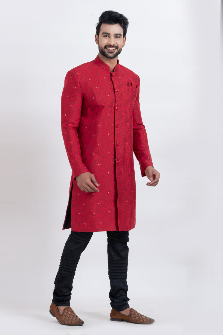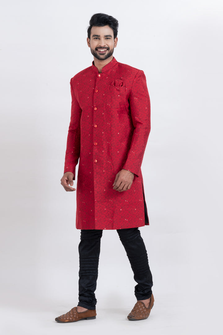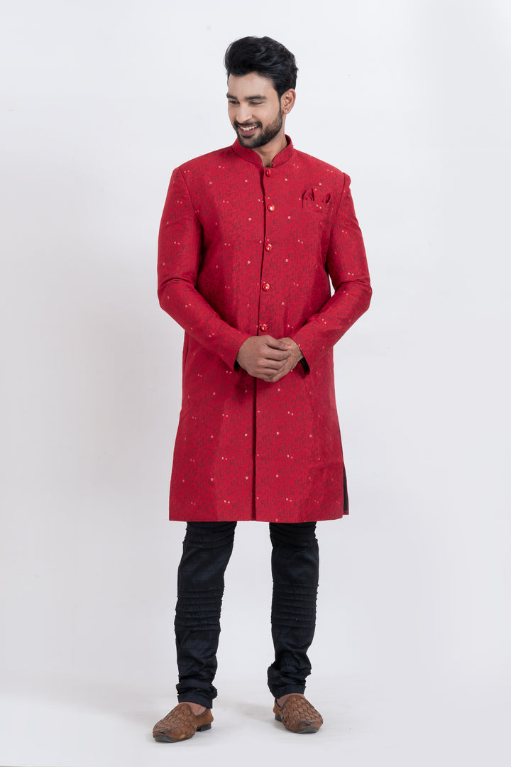 Command attention with this striking Regal Crimson Indo Western Set, a perfect blend of ethnic elegance and modern style. The outfit features a rich red textured fabric adorned with subtle sequin detailing, giving it a festive sparkle. The structured silhouette is enhanced with a bandhgala neckline, full front button placket, and a built-in pocket square for a touch of sophistication.