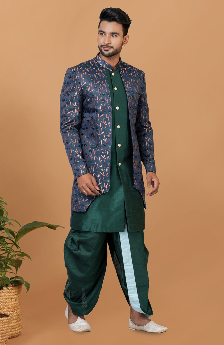 Stand out in royal flair with this bottle green and navy floral Indo Western set — where classic dhoti elegance meets contemporary luxury.