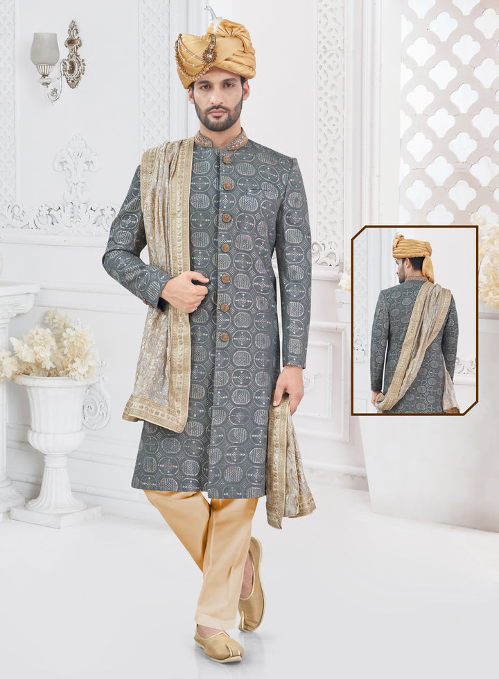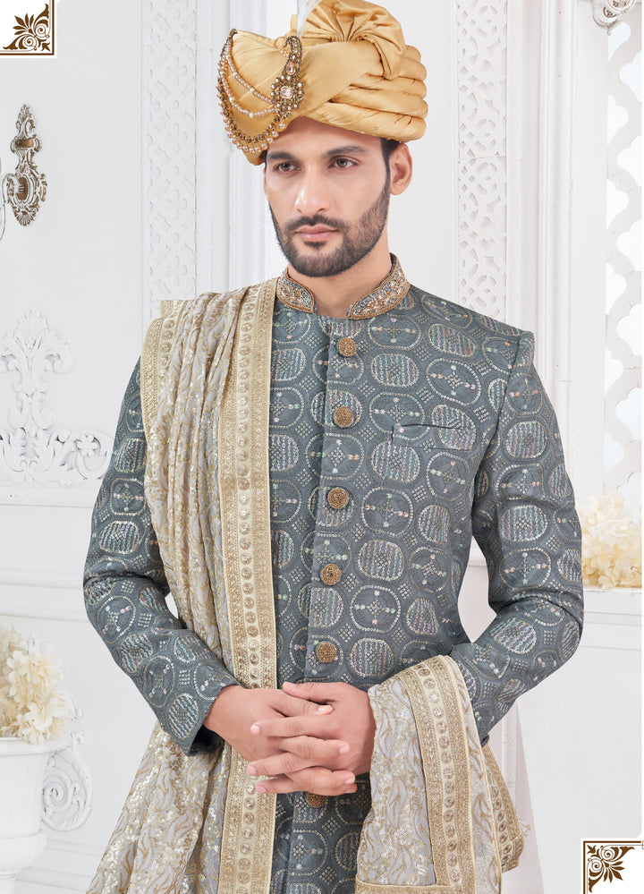 Sherwani Fabric: Rich Grey brocade adorned with intricate metallic gold thread embroidery and shimmer accents in elegant geometric motifs