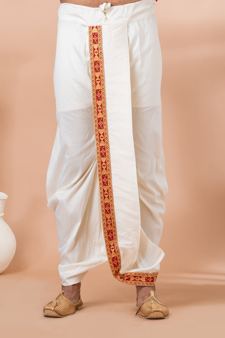 Bottom: Traditional ivory dhoti with ornate borders for that Bengali vibe
