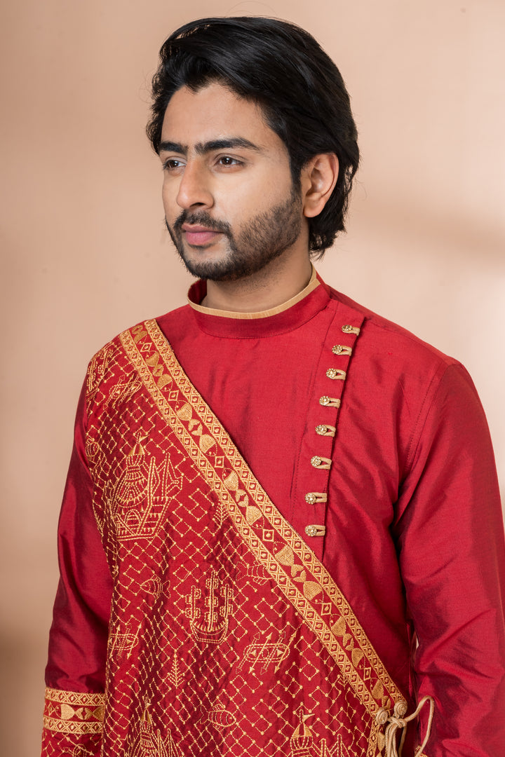 Step into tradition with a royal touch in this Bengali Dhoti Kurta Set, crafted to capture the essence of our timeless heritage. The deep maroon kurta, designed with asymmetric layering and intricate golden embroidery, reflects grandeur while staying rooted in culture. It’s paired with a classic ivory Bengali-style dhoti, beautifully bordered with maroon-gold accents – perfect for men who embrace elegance with ethnicity.