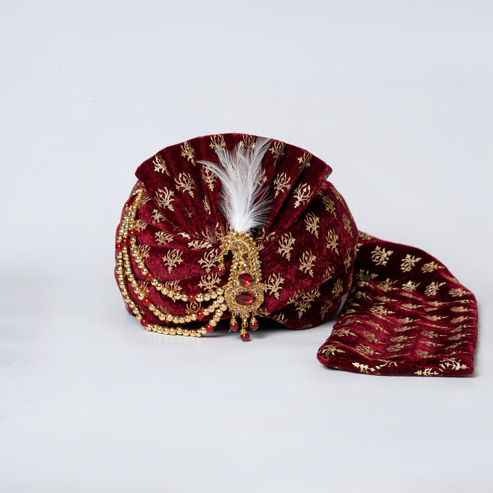 Elevate your traditional look with this Regal Maroon Embroidered Velvet Groom Pagdi, a refined blend of heritage and grandeur. Made from luxurious velvet fabric, this pagdi features intricate golden thread embroidery throughout, paired with cascading golden bead chains and a central feathered brooch adorned with red stones. Perfect for grooms and royal-themed occasions, this handcrafted turban is designed to exude sophistication, elegance, and unmatched cultural richness.