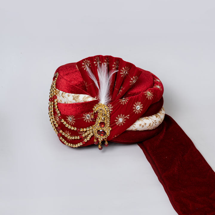 Elevate your traditional attire with this exquisitely crafted maroon velvet Sherwani Safa, designed to exude royal elegance. Embellished with intricate golden embroidery and stone-studded motifs, this turban features a stylish white feather and a luxurious gold-toned brooch accented with red gemstones. The rich velvet texture and elegant off-white brocade contrast band add a regal touch, making it the perfect headpiece for weddings, festive occasions, or cultural ceremonies. Adjustable and lightweight, it offers both comfort and grandeur in every wear.