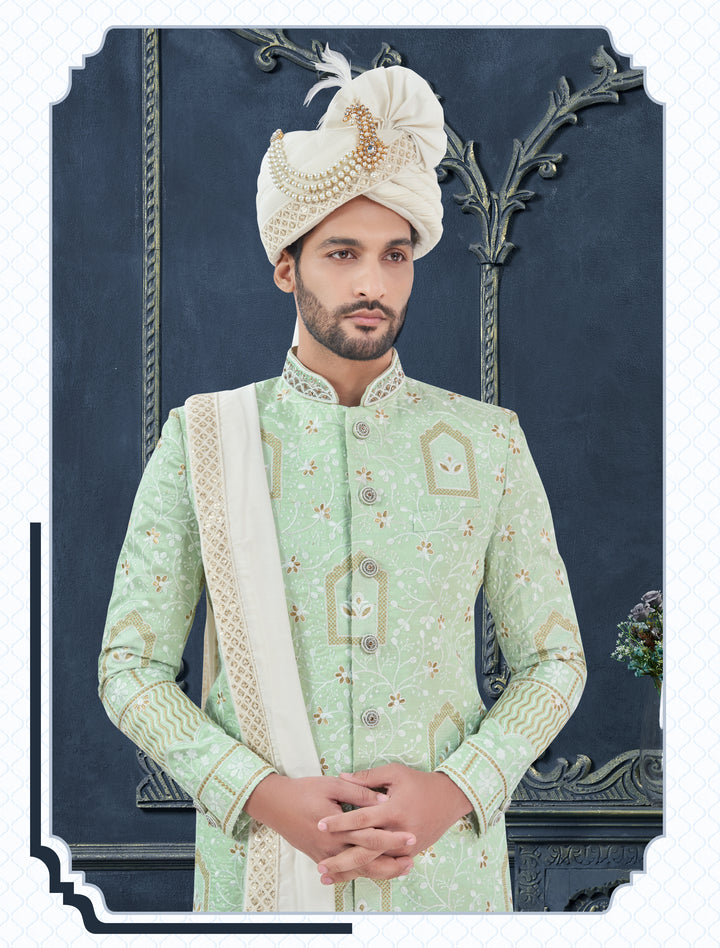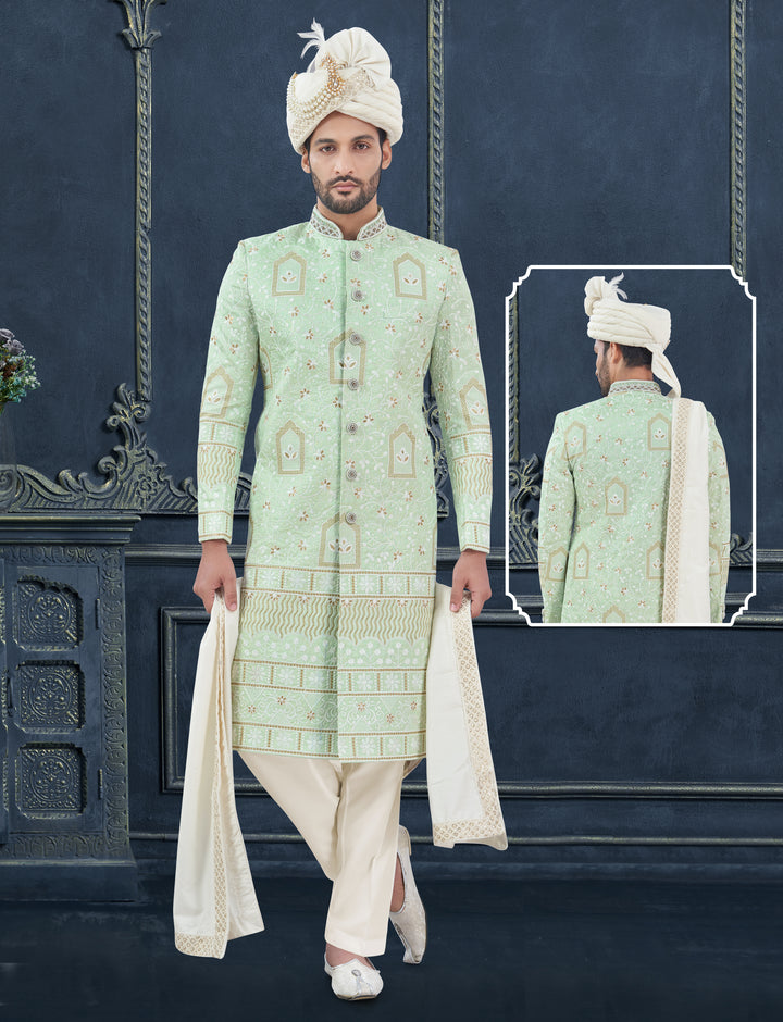 Step into timeless elegance with this Regal Mint Green Sherwani Set, a perfect blend of royalty and contemporary finesse. Intricately embroidered with delicate floral and geometric patterns, the soothing mint hue exudes grace and charm. The sherwani features a structured silhouette with ornate buttons, detailed cuffs, and traditional motifs that add a majestic touch.